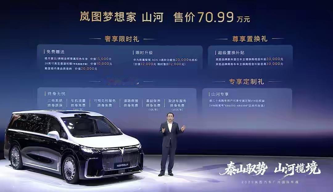 2025广州国际车展火热进行中,岚图两款重磅车型一亮相就赚足眼球,究竟有何魅力? 首先登场的是2026款梦想家新增版本——岚图梦想家山河。这款车采用豪华四座布局,前后舱静谧隔绝,仿佛置身于两个世界。后排50英寸巨幕影院搭配166°舒享躺角座椅,让你在车内就能享受移动头等舱的极致体验。 更厉害的是,它还搭载了华为乾崑ADS 4辅助驾驶与鸿蒙座舱5,智能科技感直接拉满。官方指导价已出,性价比超高!另一款旗舰力作岚图泰山也同步亮相,作为品牌五年技术积淀的结晶,综合续航超1400km,实力不容小觑。 车展现场公布售价,顶配版本更是搭载了华为乾崑ADS 4和4颗激光雷达,鸿蒙座舱5赋能智能交互,再搭配岚海智能超混动力系统,这配置简直逆天了! 岚图两款新车型,无论是豪华体验还是智能科技,都让人眼前一亮。如果你也对这两款车感兴趣,那就赶紧来评论区留言讨论吧,一起分享你的看法和期待!