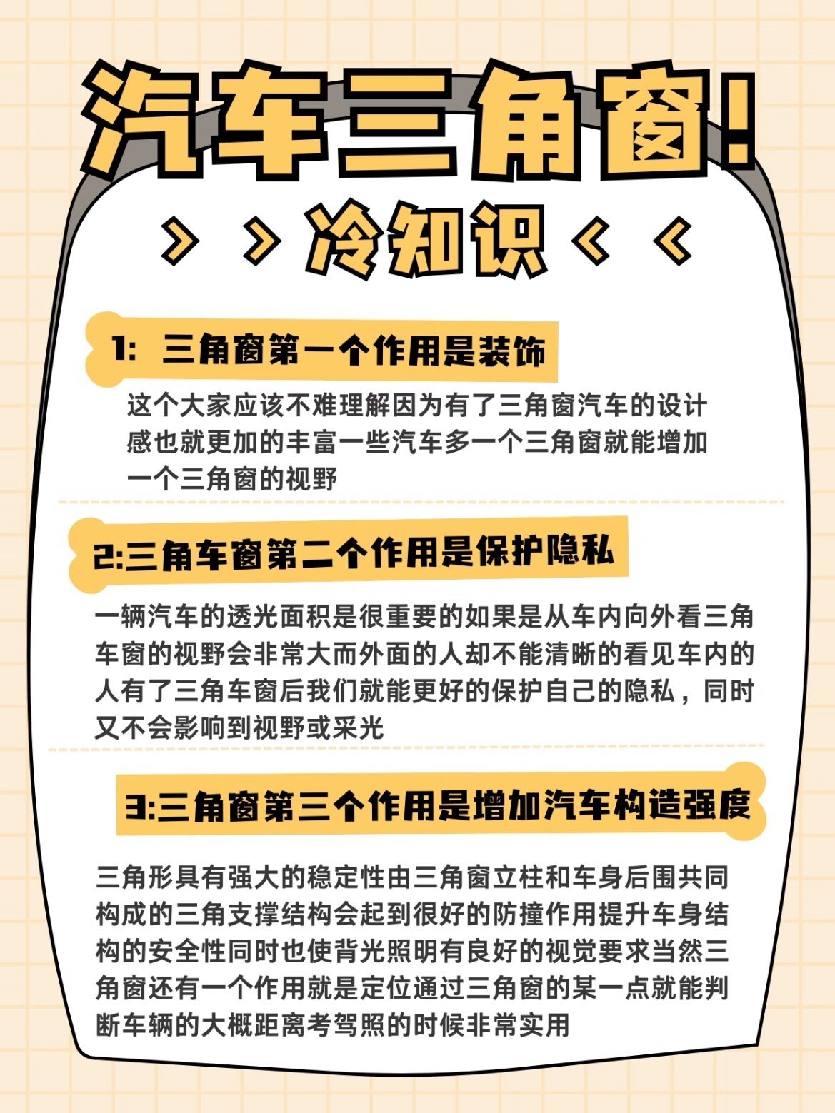 🚗别看车上那块小小的三角窗平平无奇,其实它暗藏玄机!不只是为了好看,它可是兼顾了颜值、实用和安全的多面手~🤩✨三大隐藏功能,一次说清楚1️⃣ 高颜值担当:多了三角窗,车身线条更流畅,设计感瞬间拉满,还多了一扇“看得见风景的窗”!2️⃣ 隐私保护侠:从里往外看,视野超开阔;从外往里看,却模模糊糊。不怕被围观,采光还不打折~3️⃣ 安全实力派:三角形结构超稳定,能加固车身,防撞更安心!而且,它还是倒车、判断距离的“隐形助手”,学车时是不是偷偷用过?👀💡下次坐车时,别忘了多看它一眼!小小三角窗,藏着设计师的巧思和用车的智慧~
