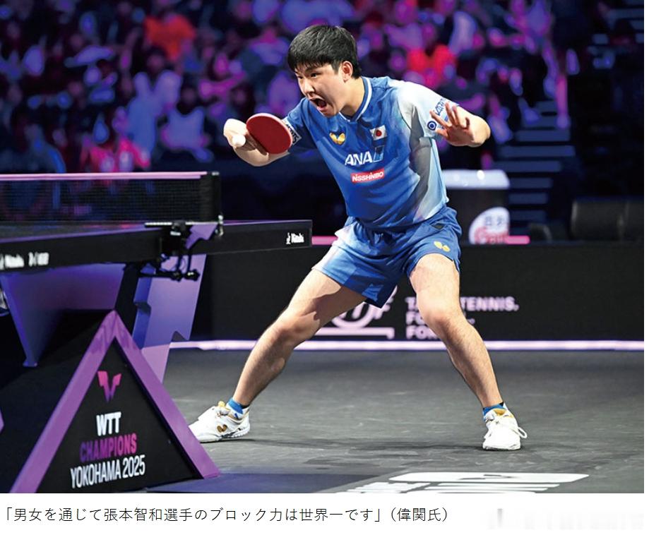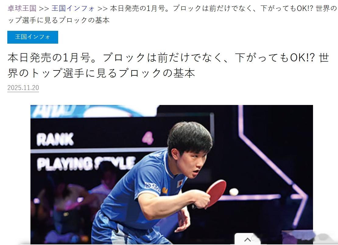 《桌球王国》26年1月号, 相关内容。“无论男女选手,张本智和的格挡能力堪称世界第一。”(伟关晴光 评)“今日发售 1 月号:正手快带之外,退台格挡亦可行!? 从世界顶级选手看格挡技术的核心精髓2025 年 11 月 20 日11 月 20 日(周四)今日发售的《桌球王国》2026 年 1 月号,主打特辑为《从防守到进攻:制胜格挡术》。本刊围绕格挡技术分设多个主题展开深度解析,其中 “顶级选手的格挡前沿秘籍” 板块,精选中国选手王楚钦、日本选手张本智和、瑞典选手莫雷加德三位世界顶尖名将。除基础格挡动作外,还将通过首尔奥运会男子双打金牌得主伟关晴光的专业深度解析,详解每位选手的拿手绝技 —— 包括反拍快带、削式格挡等技术要点。面对对手第三板强力冲击,王楚钦选择退台拉开距离完成格挡伟关晴光在解析中提到:“在日本,格挡技术给人的固有印象多是‘近台硬顶’,但在中国的训练体系中,格挡被传授为‘两种距离的技术应用’。一种是当对手从中台发起连续进攻时,采用‘近台贴防’的格挡方式;另一种则是应对对手第三板等近台强力爆冲时,采用‘退台拉开距离’的格挡策略。”(详细解析见杂志内文)不妨以顶级选手的格挡技术为借鉴,掌握能助你决胜赛场的实用格挡技巧。‘无论男女选手,张本智和的格挡能力堪称世界第一。’(伟关晴光 评)”(机翻)cr: 桌球王国