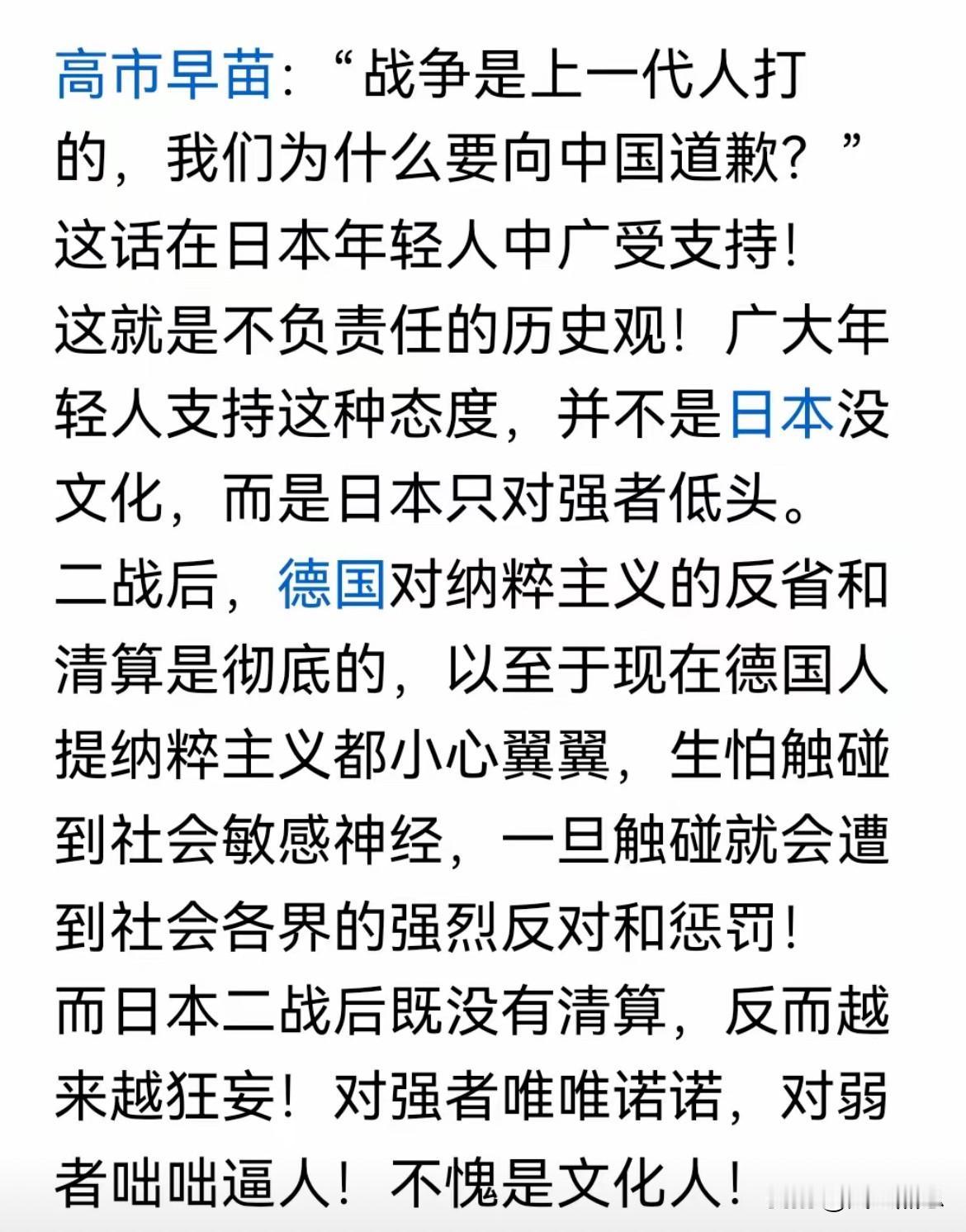 高市这种狡辩是有一定市场的,在日本人的观念中“强者不需要道歉”,没有打服他们,即使道歉也口是心非,与其纠结反反复按着其头说道歉,不如保持绝对优势,具备斩下“狗头”能力. 其实对日本并无特别的情感,不是过染指中华民族内部事务,必须有坚定的信念和决心面对…..