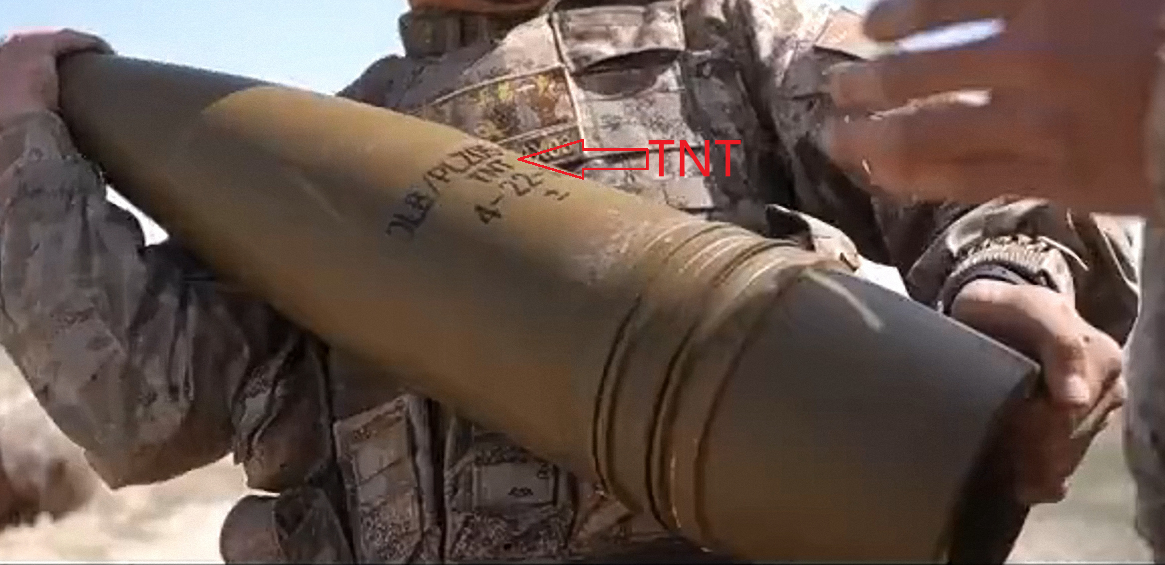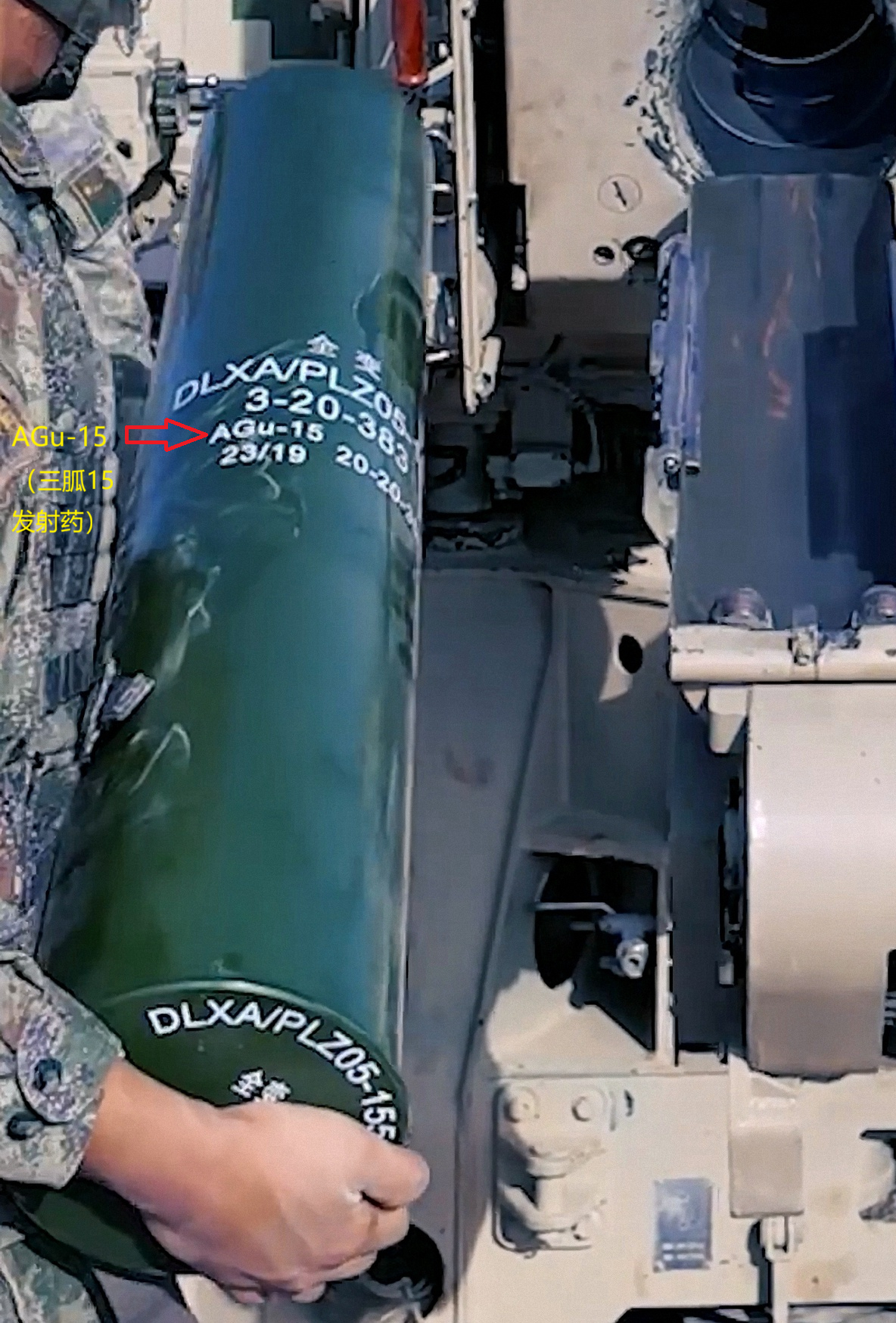 箭头处这发2020年生产的155mm DLXA/PLZ05-155弹表面的文字:DHL-1(钝黑铝1炸药),钝黑铝1炸药成分:钝化黑索今80%,易燃铝粉10%,易燃细铝粉10%;国产155弹也有装填TNT的,如图2这发155mm DLB/PLZ05炮弹表面标记有TNT(箭头处),155mm的DLB和DLXA弹有什么区别?DLB是杀爆弹?DLXA是什么弹?为什么装填的炸药不同?图4药筒表面则有AGu-15字样,这是三胍-15的拼音缩写,三胍15成分:28%硝化棉,22.5%硝酸甘油,47%硝基胍,1.5%Ⅱ号中定剂(减慢火药老化分解),1%硫酸钾(消焰剂),石墨≤0.15%(光泽剂,增加药粒装填密度),美军155炮也是三胍发射药,对炮管烧蚀低于传统的双基发射药