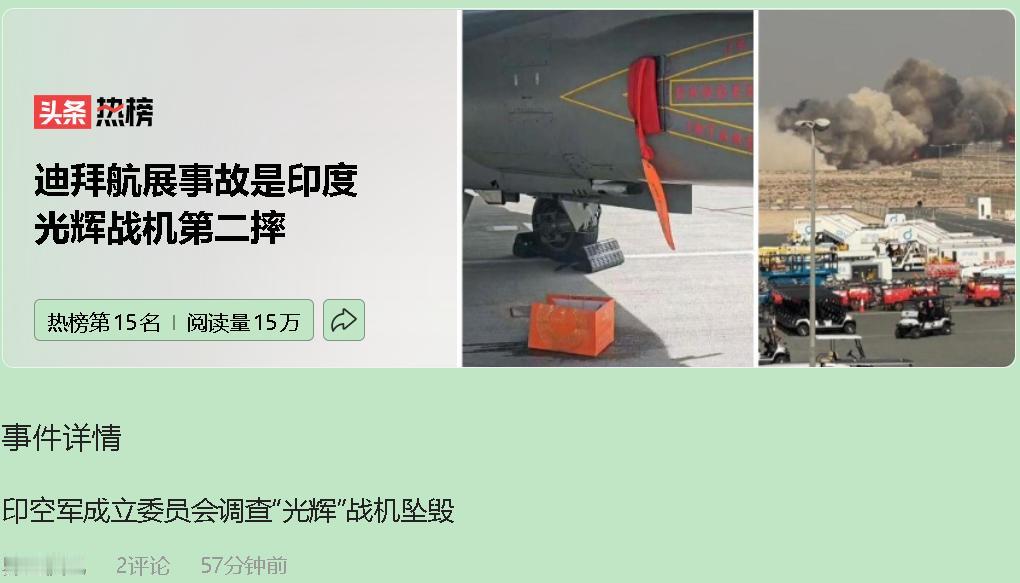 又见印度战机出事!这次是在万众瞩目的迪拜航展上。迪拜航展事故是印度光辉战机第二摔 本来是一场空中秀技,谁想到下一秒直接变成“火球秀”。“光辉”战机俯冲、爆炸、黑烟滚滚……现场观众全吓傻了。最后确认,飞行员没来得及弹射,不幸遇难。 更扎心的是,这已经是它第三次在迪拜“翻车”。前两年要么黑屏、要么系统崩,今年直接机毁人亡。航展开幕那天还被拍到机身漏油,地勤居然用纸袋在下面接——官方说是“正常排水”,可没过几天就坠机,这打脸来得太快。 “光辉”号称印度国产骄傲,可仔细一看,发动机是美国的,雷达以色列的,弹射座椅英国的……说白了,就是个“万国牌”组装机。关键部件全靠买,自己拼在一起就难免出bug。2023年黑屏、2025年坠机,毛病一次比一次狠。 依我看,这是军工体系的“硬伤”:重宣传、轻质量,急着秀肌肉,却忽略了最基础的技术沉淀。33年才搞出一架战机,服役不到十年就连摔两架——这不是偶然。 说到底,国防现代化真不是靠买零件就能拼出来的。没自己的核心技术,再炫的表演也可能瞬间崩塌。这次坠毁,炸醒的不只是印度,更是所有想走“捷径”的人——实力,从来没法靠热搜撑起来。耗30年研制,光辉战机啥水平?