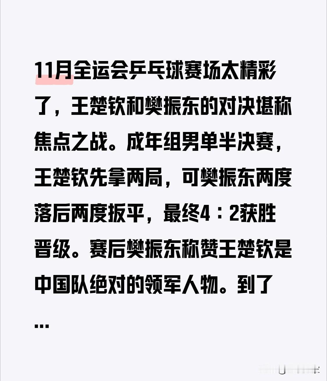 11月全运会乒乓球赛场太精彩了,王楚钦和樊振东的对决堪称焦点之战。成年组男单半决赛,王楚钦先拿两局,可樊振东两度落后两度扳平,最终4∶2获胜晋级。赛后樊振东称赞王楚钦是中国队绝对的领军人物。 到了男团决赛,王楚钦和樊振东再次交手,这也成了全网关注焦点。王楚钦赛后回应,整体表现较平稳,还有提升空间,还想再跟樊振东打一场,承认樊振东非常强大。他撞球台那事儿,他说别在意那些不重要的细节。这赛场火药味十足,期待他们之后更多精彩对决! 王楚钦荣耀夺冠 赛场雄狮王楚钦 大满贯王楚钦 国球乒乓王楚钦 赛场雄狮王楚钦 赛场硬核王楚钦 王楚钦荣耀夺冠 大满贯王楚钦 乒乓王楚钦 王楚钦巴黎男单