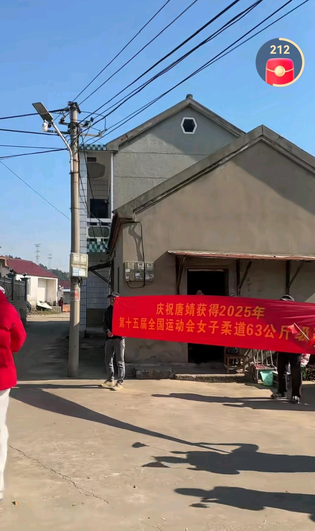 11月20日,安徽姑娘唐婧回农村老家了,村民对这位冠军热情相迎,拉着横幅祝贺唐婧,获的冠军。 村里的乡间道路上放起了响亮的鞭炮,亲朋好友在村里拿着鲜花迎接她回来,同时也给唐婧的妈妈送上了鲜花,妈妈开心的合不拢嘴,鞭炮很长,几十米,噼里啪啦的声响打破了村里的宁静。 在唐婧的家里还看到了“一等功臣之家”的牌匾,这是6年前,唐婧在武汉军运会上获得冠军后受到的奖励,唐婧这次凯旋而归,让乡亲们感受到了自豪。