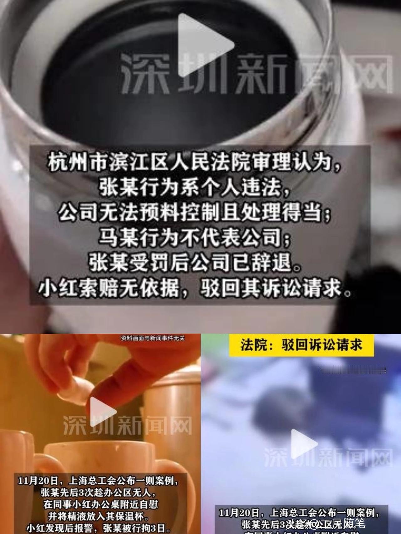 水杯多次被男同事射入精液!女子3次饮用后报警,同事行径刷新下限,公司回应更令人心寒… 跟你说个事儿,我一开始都以为自己眼睛花了—— 杭州有个姑娘,发现自己保温杯里的水啊,连着三天都有股怪味儿。她赶紧去调监控,这不看不知道,一看吓一跳,头皮都发麻了! 监控里清清楚楚地显示,她一个男同事张某,竟然先后三次偷偷摸摸地往她杯子里……往杯子里射那啥!(实在说不出口,你懂的!) 这事儿败露后,那男的还满不在乎地承认了,说:“就是我自己弄完放进去的呗!” 姑娘气得不行,直接报了警。公司倒是把张某给开除了,可法院那边却说,企业已经尽到管理责任了。 最让人寒心的是公司的回应,轻飘飘一句:“这是他个人行为,跟我们公司没关系。” 那姑娘最后没办法,只能辞职了。她说现在一看到保温杯就恶心反胃。可你猜怎么着?法律竟然认定,这还不算“职场环境恶劣”! 真是没见过这么离谱的!杯子里的脏东西,好好洗洗也就干净了。可某些人的底线啊,早就馊得没法闻,洗都洗不干净了! 你说这事儿气人不气人? 奶茶异物事件
