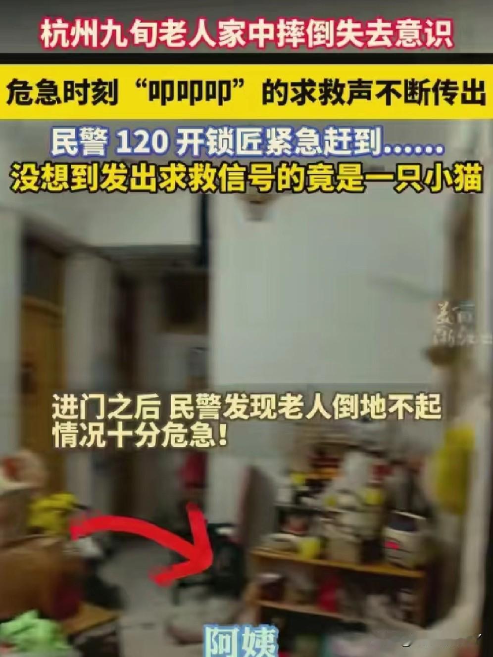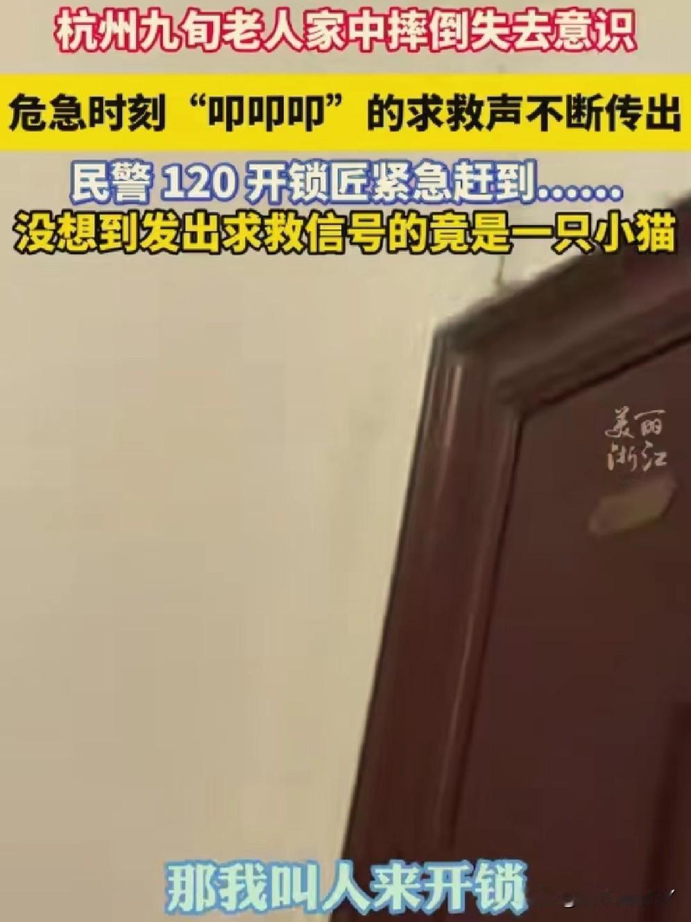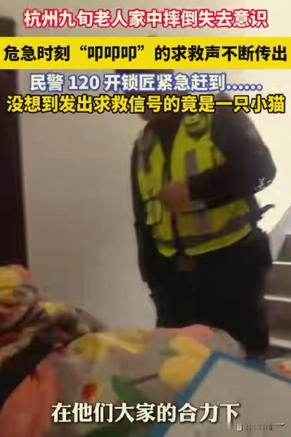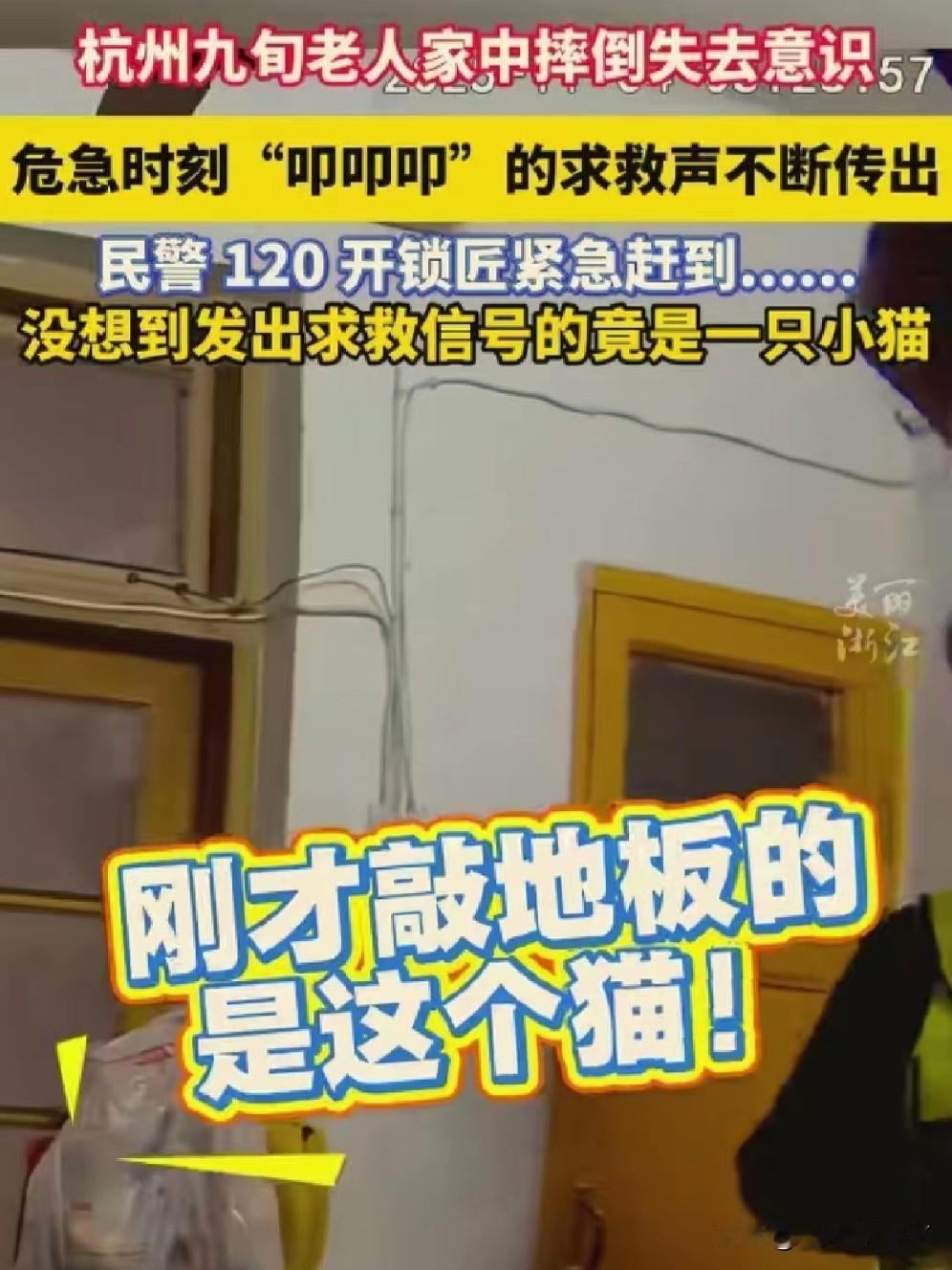 11月13日,杭州上演暖心救援!九旬老人晕倒,小猫“叩叩叩”敲门求救,民警接警火速驰援! 11月13日,浙江杭州一位九旬老人在家中意外摔倒,陷入昏迷,情况万分危急。 附近热心群众发现老人多日没出门,隐约察觉到情况异常,担心老人安危,便第一时间拨打了报警电话。 民警接到警情后,火速赶往现场,到达老人家门口时,先是尝试敲门呼喊,却始终没有得到回应。 本着对群众安全负责的态度,民警没有轻易离开,而是将耳朵贴在门边仔细聆听,不放过任何细微声响。很快,一阵持续的“叩叩叩”敲击声传入耳中。 为了确认屋内情况,民警对着门喊道:“阿姨,你要是有危险,就再敲两下地板!”话音刚落,屋内便传来“叩叩”回应声。 民警立刻判断老人可能遇险,迅速联系开锁匠到场。 门被打开的瞬间,大家看到老人倒地不起,意识已经十分模糊。 民警当即找来棉被为老人盖上保暖,并配合随后赶到的120急救人员展开救助。 这时大家才发现,刚才那一声声救命的“叩叩”声 ,竟是老人养的小猫用爪子敲地板发出的声响。 最终,在热心群众、民警、急救人员和这只聪明小猫的共同努力下,老人得到了及时救治。 这场11月13日的意外,因善意与灵性变的格外温暖,也让我们看到:人间有爱,动物有情,每一次 及时的援手,都能为生命撑起希望。你家猫咪有哪些让你感动的瞬间?冬日生活打卡季 创作训练营开营了