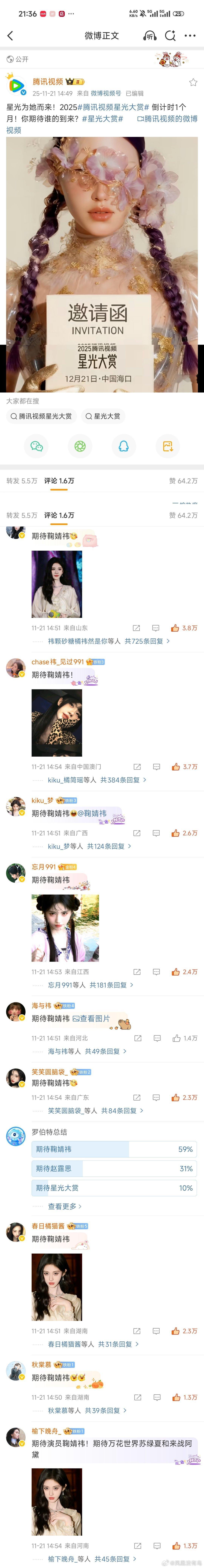 腾讯视频星光大赏评论区前排都是鞠婧祎粉丝太牛了橘丝