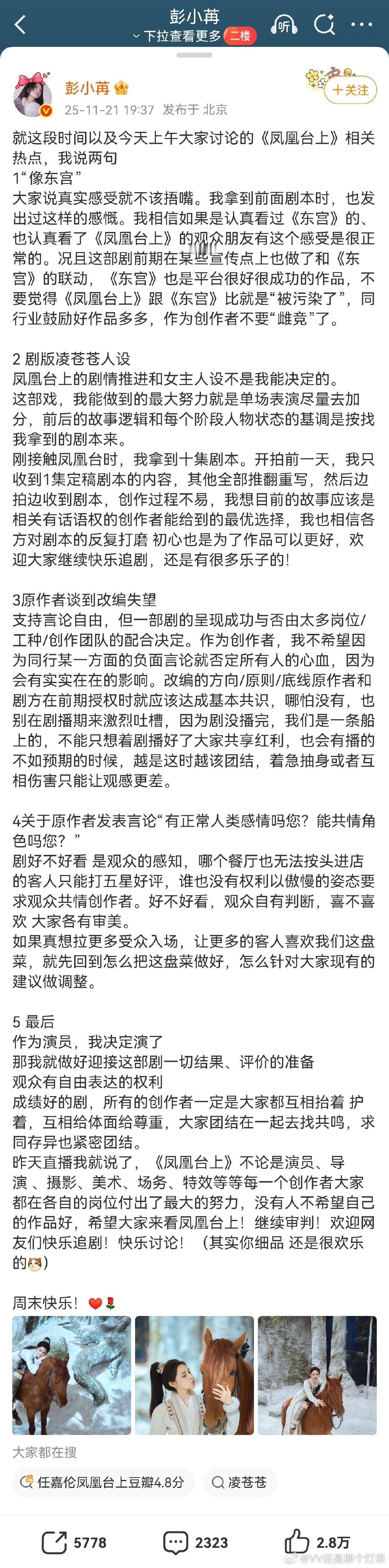 彭小苒回应凤凰台上作者的言论我看了一下作者的言论和彭小冉的回复咋说嘞,好多作者明