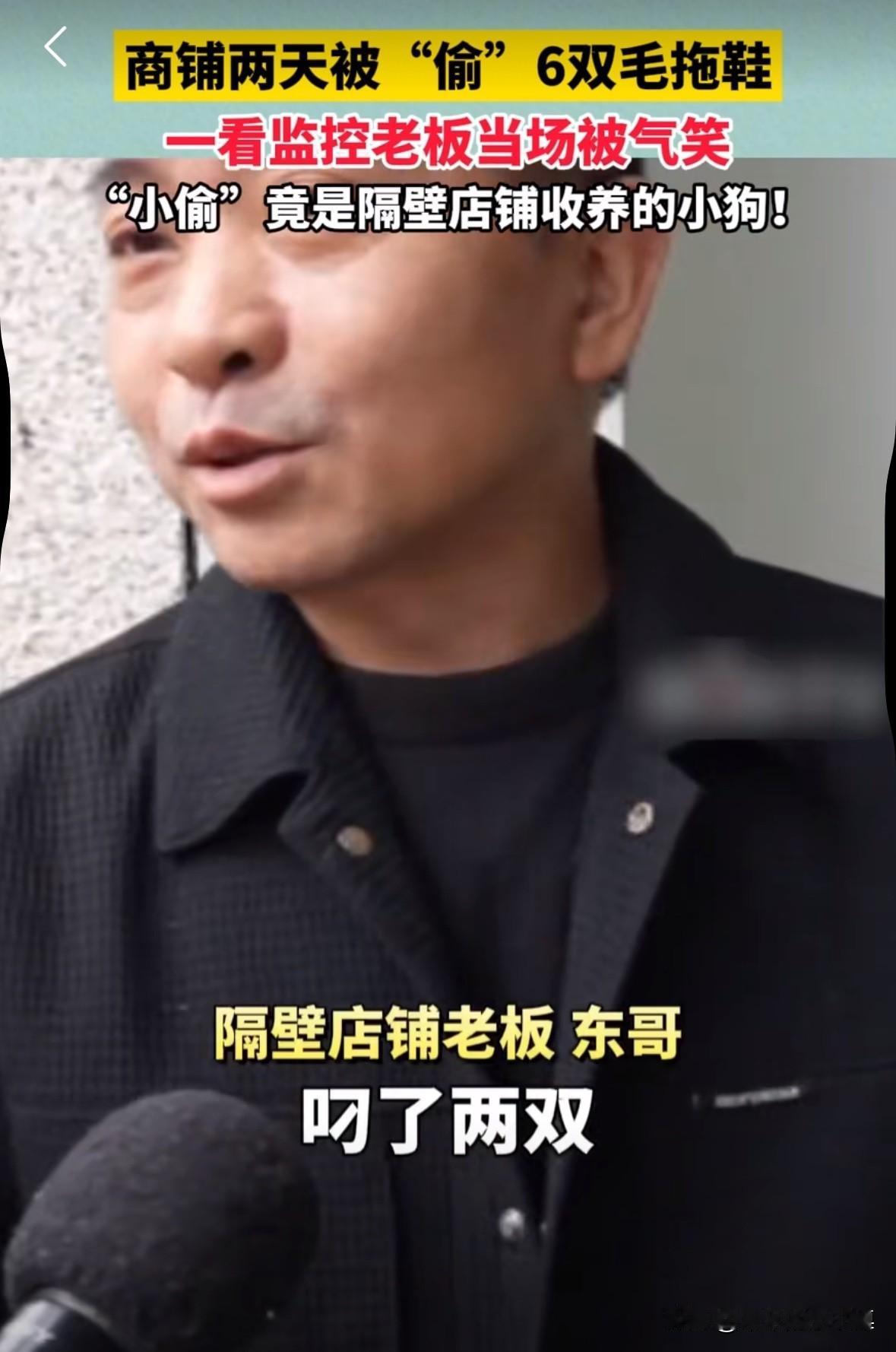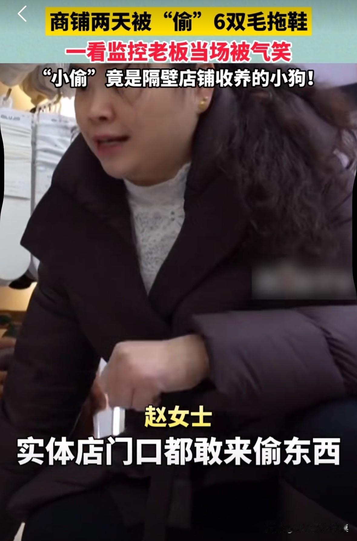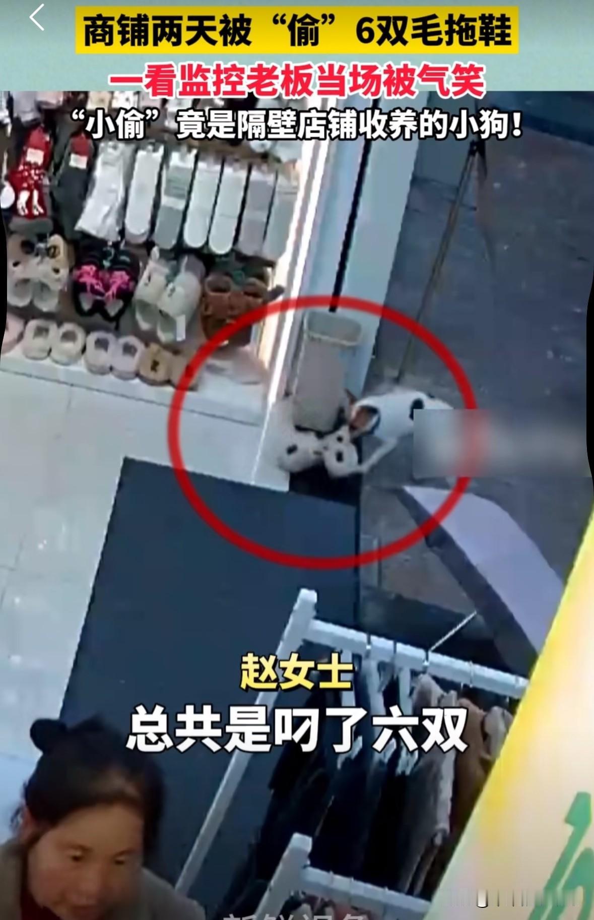 重庆一家店铺里,两天时间被偷了六双拖鞋,店主一看监控瞬间被气笑了! 监控显示,小偷是何必商铺收养的小狗,这个小狗就是爱叼东西。 卖鞋的店主说:“只要是不是人偷的我心里就高兴。” 狗主人知道后,先把狗打了一顿,非得给钱进行赔偿,店主大气的的说:“没必要,算了,我们都是邻居。” 这小狗真的得教训一下了,还好这个女店主好说话,如果遇到脾气不好的,不仅要赔偿还少不了口水战。偷东西小狗