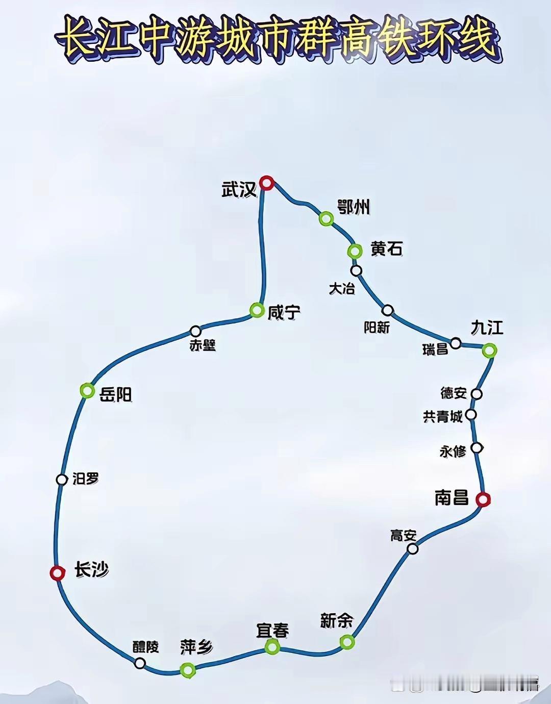 长江中游城市群高铁大环线串起了中三角三大省会城市武汉,长沙,南昌!这条大环线高铁线路从武汉沿京广高铁南下经咸宁,岳阳到长沙往东经沪昆高铁萍乡,宜春,新余到南昌北上经昌九客专到九江经武九高铁黄石,鄂州回到终点武汉站!开行这条高铁环线可以加強中三角湖北,湖南和江西的联系,形成长江中游经济纽带且有重大意义!