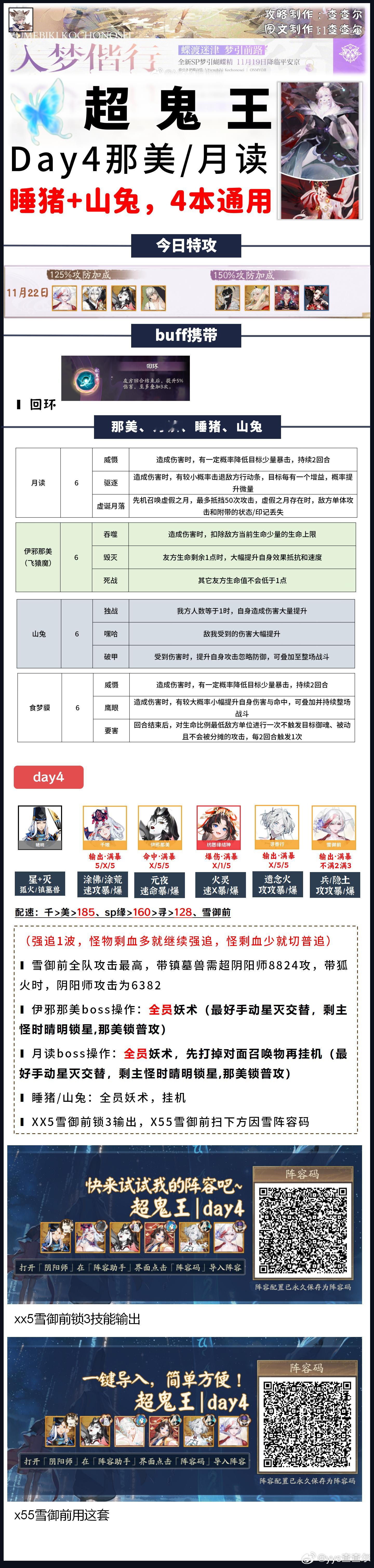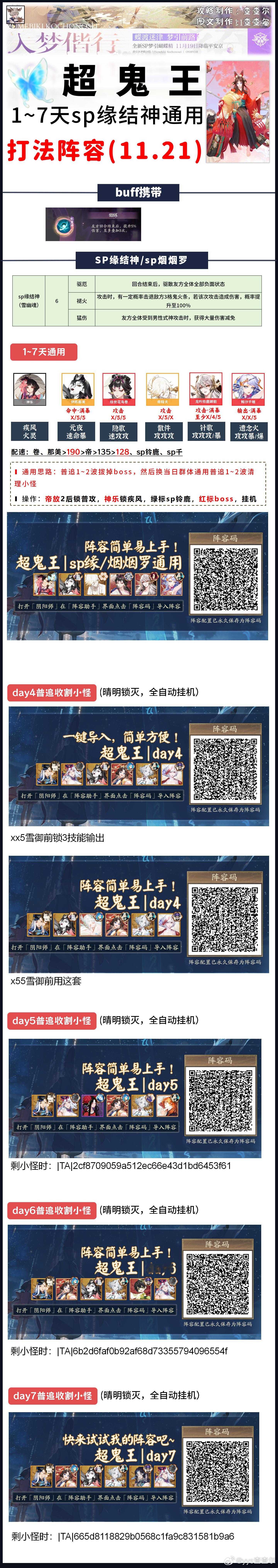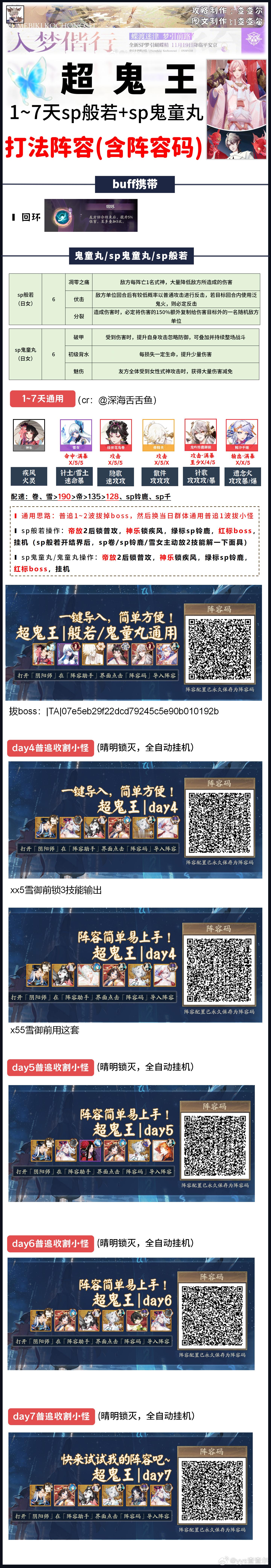 【超鬼王】dya4全鬼王阵容+阵容码一键配■今天特攻是雪御前,凡涉及到雪御前的阵容,我都做了两套阵容码,一套xx5千姬阵容,一套x55因幡阵容,照顾全部玩家■带千姬的阵容也可以用今日特攻sp一目连,正式服修复了互动bug,sp一目连可以放心妖术了day4:1~4星+5、6星收小怪:|TA|6241d2e45f9568f8a2a00625dcaaa263(xx5雪御前)|TA|0c9a72bae434ce7d4b3b1f98244a0f5b(x55雪御前)5星+部分6星通用:①鬼童丸/sp鬼童丸/sp般若|TA|07e5eb29f22dcd79245c5e90b010192b②sp九命猫/伊邪那美|TA|6241d2e45f9568f8a2a00625dcaaa263(xx5)|TA|0c9a72bae434ce7d4b3b1f98244a0f5b(x55)③sp烟烟罗/sp缘结神|TA|3480095f2bfeeedd895fe670179a22e2④sp灯/鬼金羊:|TA|f73490cb27ecd71ff4df3476672d22b2(xx5)|TA|24af375947c7f1570dd68764e35956a4(x55)⑤封阳君/山风:|TA|28d3f48293daddbabb1cc404b4358ddd⑥sp荒川/彼岸花/泷:|TA|1bc10046e5bc912a5f5e18c7123051b1(xx5)|TA|c6530c7e0b7184fa98b39d13591787db(x55)⑦御馔津:|TA|a0df7d1e09f5ca271d4b0d6894cdad5b⑧铃彦姬:|TA|6bfa256001ba92ba1e25f70ab5ab5dce⑨荒骷髅:|TA|874e254c9701684b8dc494db7c4d043c(xx5)|TA|7ac6a7a880c3f7be6e92d6f8a4032ce4(x55)6星:那美/月读/睡猪/山兔:|TA|6241d2e45f9568f8a2a00625dcaaa263(xx5)|TA|0c9a72bae434ce7d4b3b1f98244a0f5b(x55)sp不见岳:|TA|4da42f197b91b7b3e6efcbc11ae36fa8平将门:|TA|5deedbb0b426992d3b863e0ad9d370d1