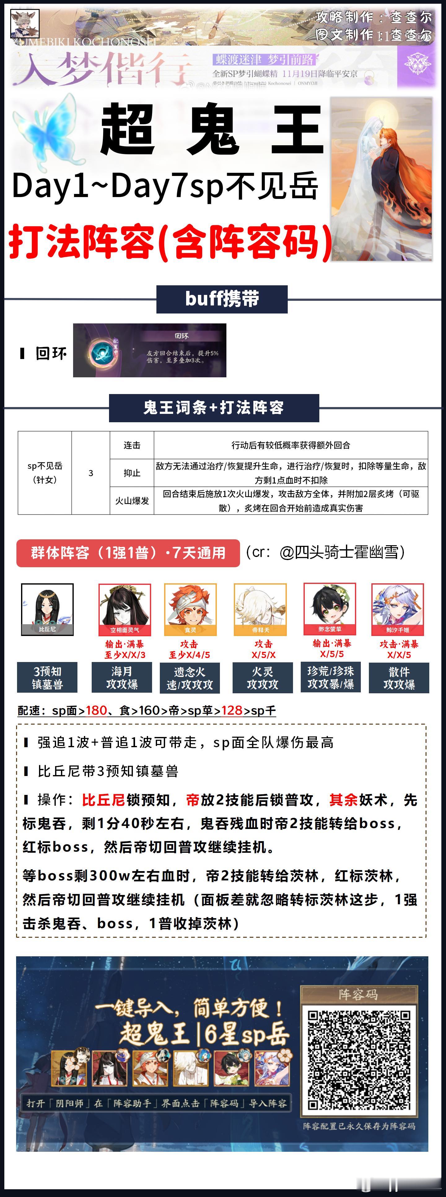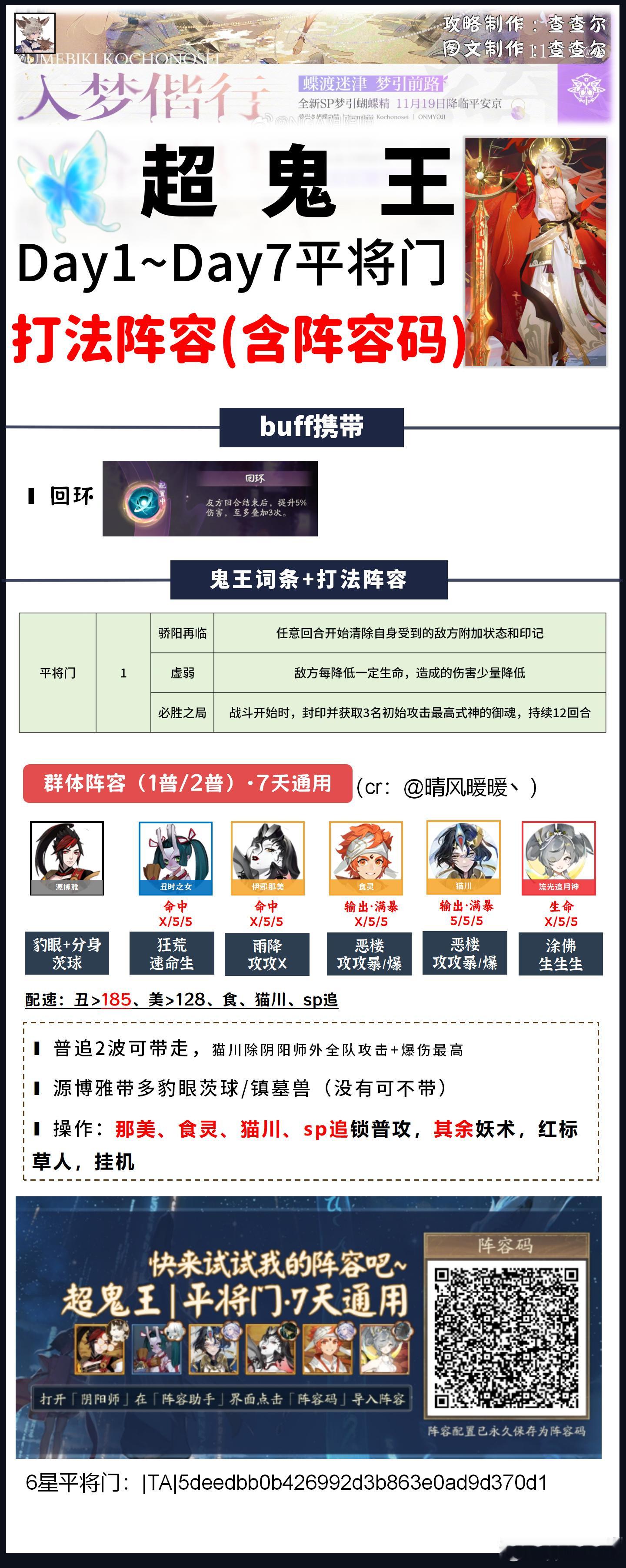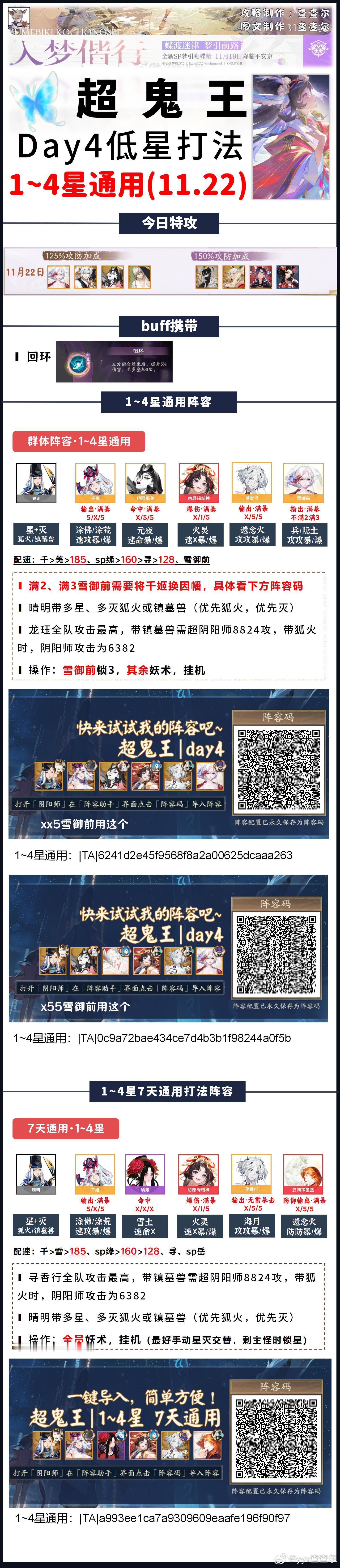 【超鬼王】dya4全鬼王阵容+阵容码一键配■今天特攻是雪御前,凡涉及到雪御前的阵容,我都做了两套阵容码,一套xx5千姬阵容,一套x55因幡阵容,照顾全部玩家■带千姬的阵容也可以用今日特攻sp一目连,正式服修复了互动bug,sp一目连可以放心妖术了day4:1~4星+5、6星收小怪:|TA|6241d2e45f9568f8a2a00625dcaaa263(xx5雪御前)|TA|0c9a72bae434ce7d4b3b1f98244a0f5b(x55雪御前)5星+部分6星通用:①鬼童丸/sp鬼童丸/sp般若|TA|07e5eb29f22dcd79245c5e90b010192b②sp九命猫/伊邪那美|TA|6241d2e45f9568f8a2a00625dcaaa263(xx5)|TA|0c9a72bae434ce7d4b3b1f98244a0f5b(x55)③sp烟烟罗/sp缘结神|TA|3480095f2bfeeedd895fe670179a22e2④sp灯/鬼金羊:|TA|f73490cb27ecd71ff4df3476672d22b2(xx5)|TA|24af375947c7f1570dd68764e35956a4(x55)⑤封阳君/山风:|TA|28d3f48293daddbabb1cc404b4358ddd⑥sp荒川/彼岸花/泷:|TA|1bc10046e5bc912a5f5e18c7123051b1(xx5)|TA|c6530c7e0b7184fa98b39d13591787db(x55)⑦御馔津:|TA|a0df7d1e09f5ca271d4b0d6894cdad5b⑧铃彦姬:|TA|6bfa256001ba92ba1e25f70ab5ab5dce⑨荒骷髅:|TA|874e254c9701684b8dc494db7c4d043c(xx5)|TA|7ac6a7a880c3f7be6e92d6f8a4032ce4(x55)6星:那美/月读/睡猪/山兔:|TA|6241d2e45f9568f8a2a00625dcaaa263(xx5)|TA|0c9a72bae434ce7d4b3b1f98244a0f5b(x55)sp不见岳:|TA|4da42f197b91b7b3e6efcbc11ae36fa8平将门:|TA|5deedbb0b426992d3b863e0ad9d370d1