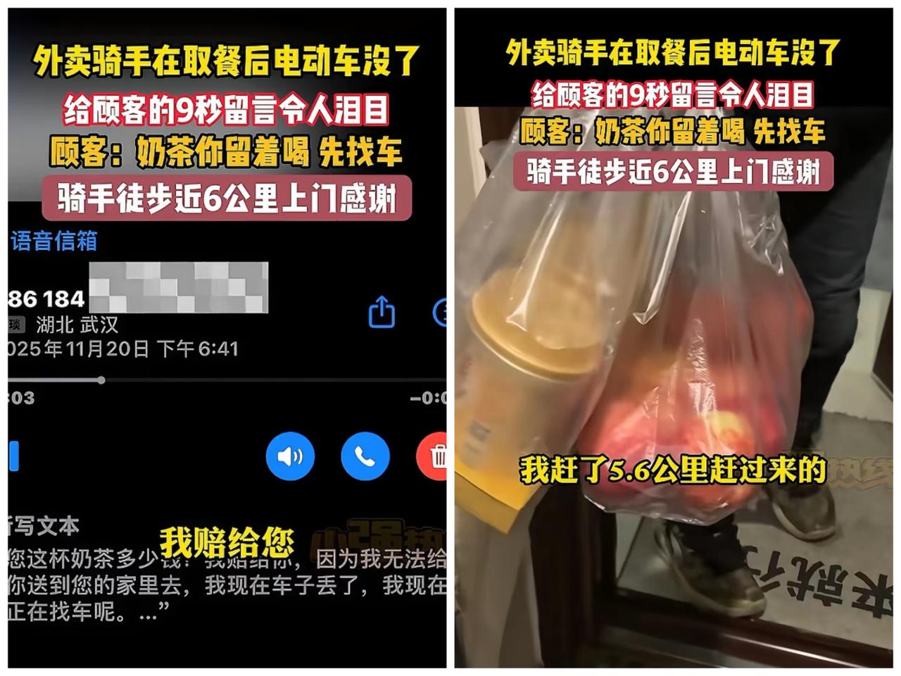 真是令人感人的一幕,这世界的美好,往往就藏在陌生人之间的温柔相待里。就在前几天,湖北一位外卖小哥的经历刷屏了:他在取餐时发现电动车被偷,强忍着焦急,他第一时间拨通顾客电话道歉,声音哽咽却依然坚持要赔奶茶钱。 没想到顾客不仅没有责怪,反而暖心回应:"奶茶算我请你,别着急,我已经帮你报警调监控了。"更让人动容的是,这位执着的小哥随后徒步六公里,提着新买的奶茶和苹果专程登门道谢。 这场温暖的相遇让我们看到:善良从来不是单方面的付出,而是两颗真诚之心的同频共振。在这个快节奏的时代,这样不期而遇的温暖,恰恰是最打动人心的人间烟火。 你是否也曾被陌生人的善意点亮过平凡的一天?欢迎在评论区分享那个让你难忘的温暖瞬间。