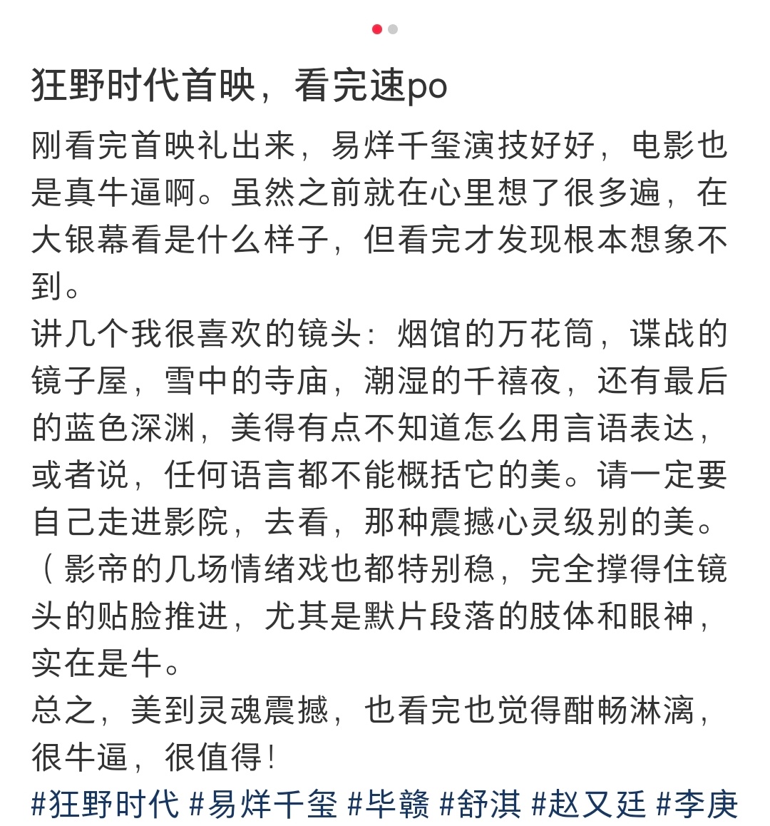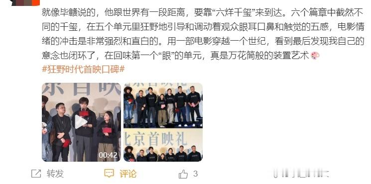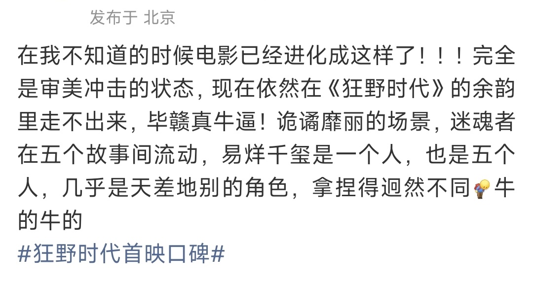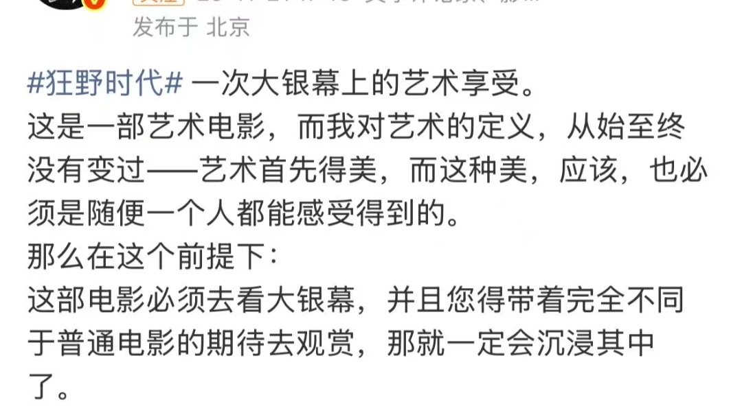 狂野时代首映貌似好评如潮啊,都在说电影画面美得震撼,视听感觉震憾,最震撼的是易烊千玺的演技,一人分饰五角,是电影成功的定心丸。看完感觉自己想长脑子了,信息量还是很大的。有点迫不及待想去看了诶。