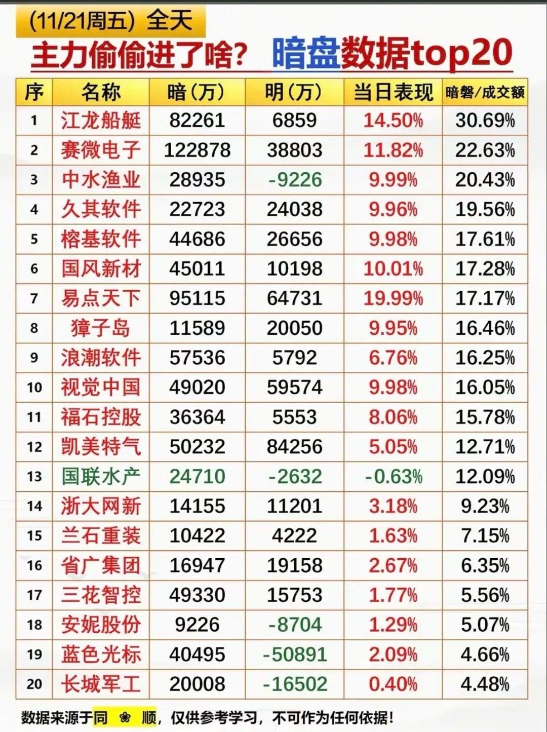 11.21周五 尾盘半小时 主力抢筹前20!99股跌停,5000多家下跌!尾盘资金抢筹,主力看好公司未来,在短期内吸收筹码,在收盘前偷偷买入抢筹码。还有一种就是无量拉升,尾盘偷袭,待次日早盘低开派发给散户,达到出货目的。连续多日,有的股票属于错杀,主力在尾盘偷偷抢筹。
