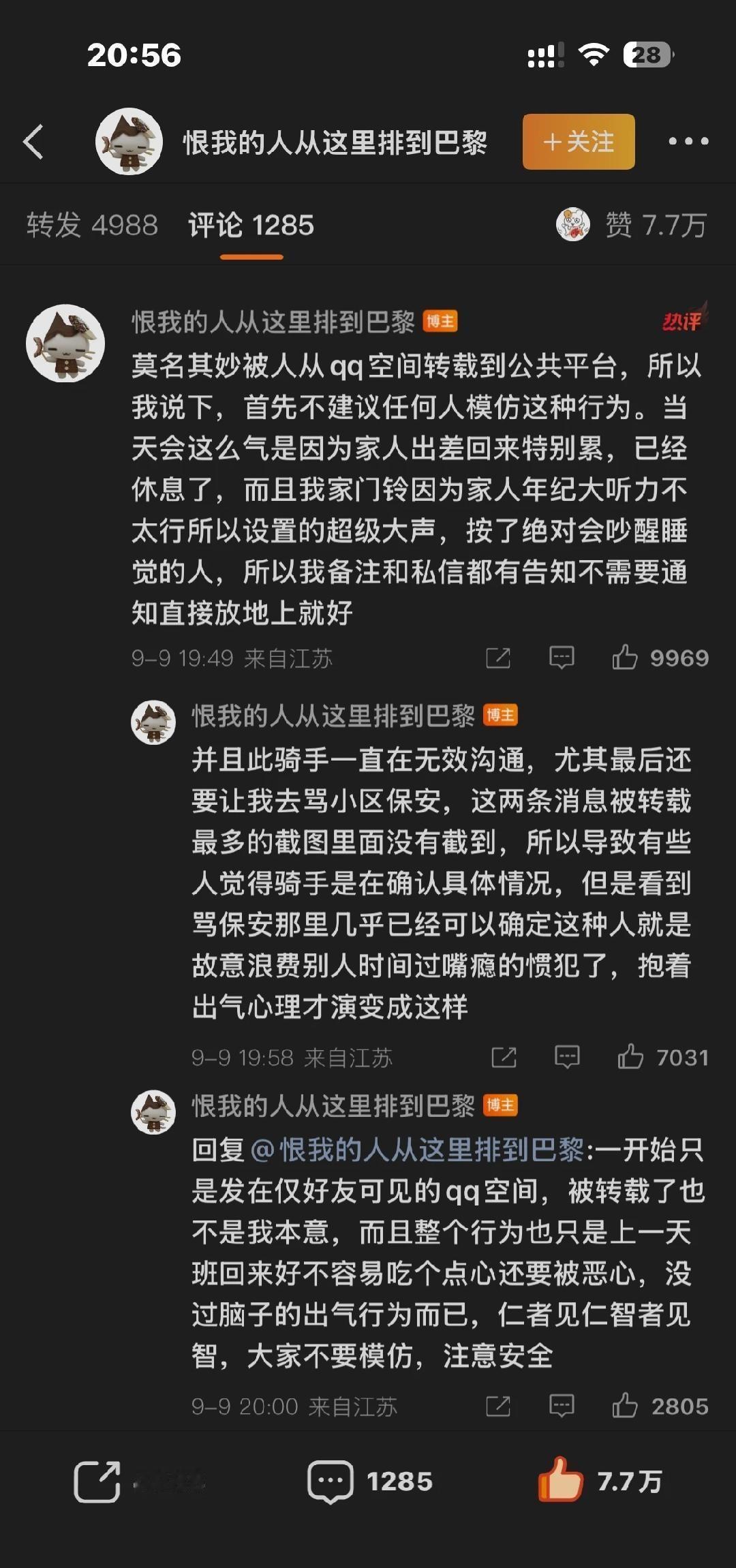 如何看待女子点外卖备注“不要敲门”遭到骑手调侃反问“敲了会怎么样”“帮我骂保安”,遂持刀等外卖? 【小姐姐在电梯口持刀等外卖员 -哔哩哔哩】 ------------------------------------ 之前刷到一个外卖骑手发dy,吐槽很多顾客都是只把门打开一条缝伸手出去拿外卖,觉得顾客这样子是不尊重他 我就特别无语,你管人家怎么拿的?又没打你骂你挑衅你,你把外卖交过去赶紧去跑下一单得了呗,怎么就不尊重你了?难不成还要请你进去喝杯茶?