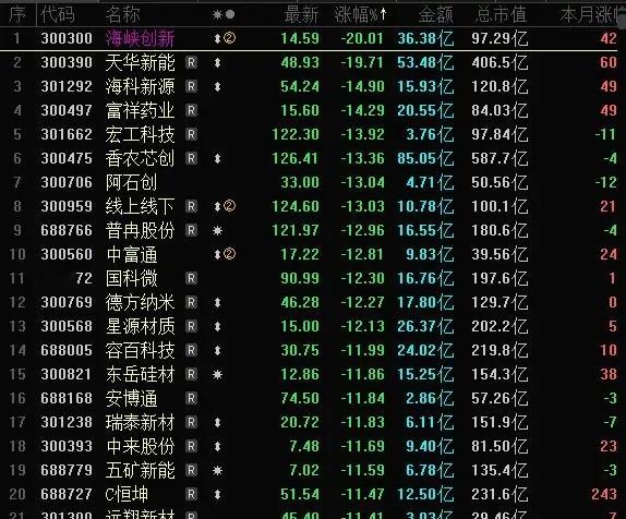 今天A股跌幅榜跌停股密密麻麻,超100家跌停跌超10%。跌幅榜清一色市场主线核心股,科技股,资源股占据多数,高位股大跌补跌,市场强烈的亏钱效应。海峡创新复牌20CM跌停,香农芯创大跌13CM,平潭发展复牌10CM跌停,海天发展10CM跌停,大中矿业10CM跌停,合富中国10CM跌停,盛新锂能10CM跌停,德明利10CM跌停,赣锋锂业10CM跌停,天齐锂业10CM跌停,,九牧王10CM跌停,孚日股份10CM跌停,三木集团10CM跌停,华夏幸福10CM跌停,以上是近期人气高标股。今天超5000家下跌,近1400家跌超5%,人均半个跌停。很显然,主力资金昨天借着利好高开低走砸盘出货,今天借着利空低开低走出货,一波快速杀跌,短线高位套牢者众,一旦套牢者忍不住割肉,市场就要反弹。