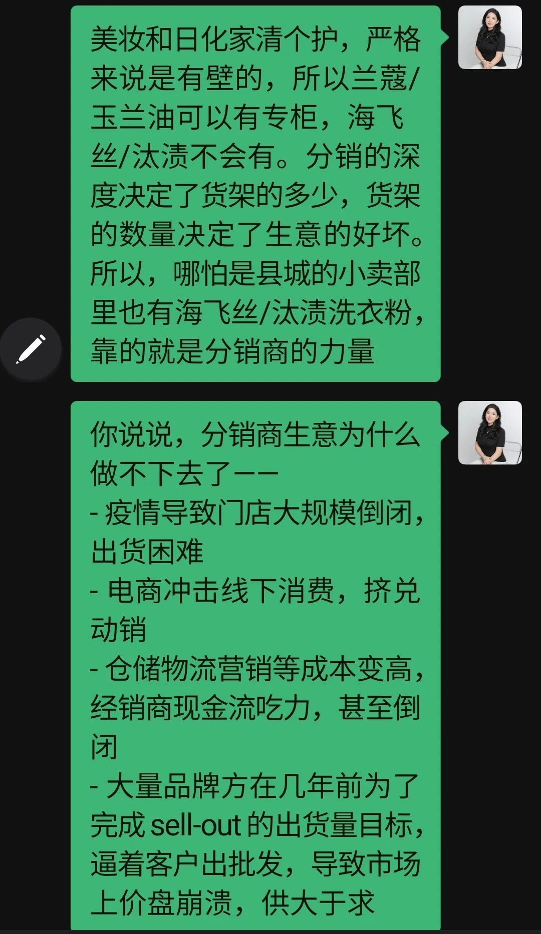 美妆和日化家清个护,严格来说是有壁的,所以兰蔻/玉兰油可以有专柜,海飞丝/汰渍不会有。分销的深度决定了货架的多少,货架的数量决定了生意的好坏。所以,哪怕是县城的小卖部里也有海飞丝/汰渍洗衣粉,靠的就是分销商的力量。
