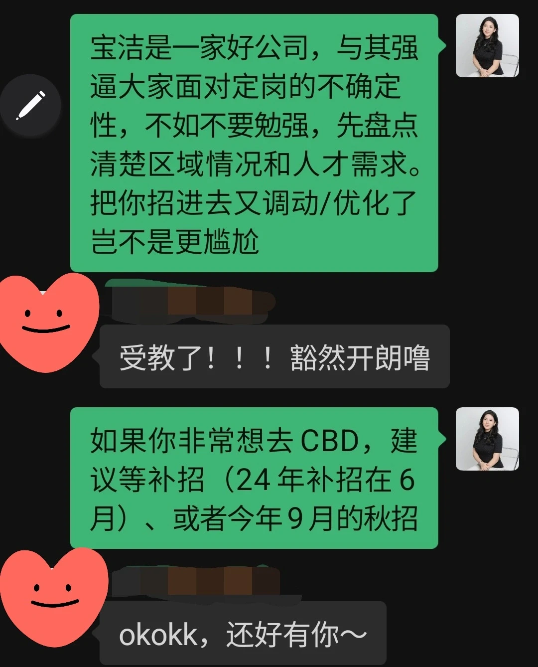 并且,CBD的招聘和定岗对于base地都有较强的不确定性。宝洁是一家好公司,与其强逼大家面对定岗的不确定性,不如不要勉强,先盘点清楚区域情况和人才需求。