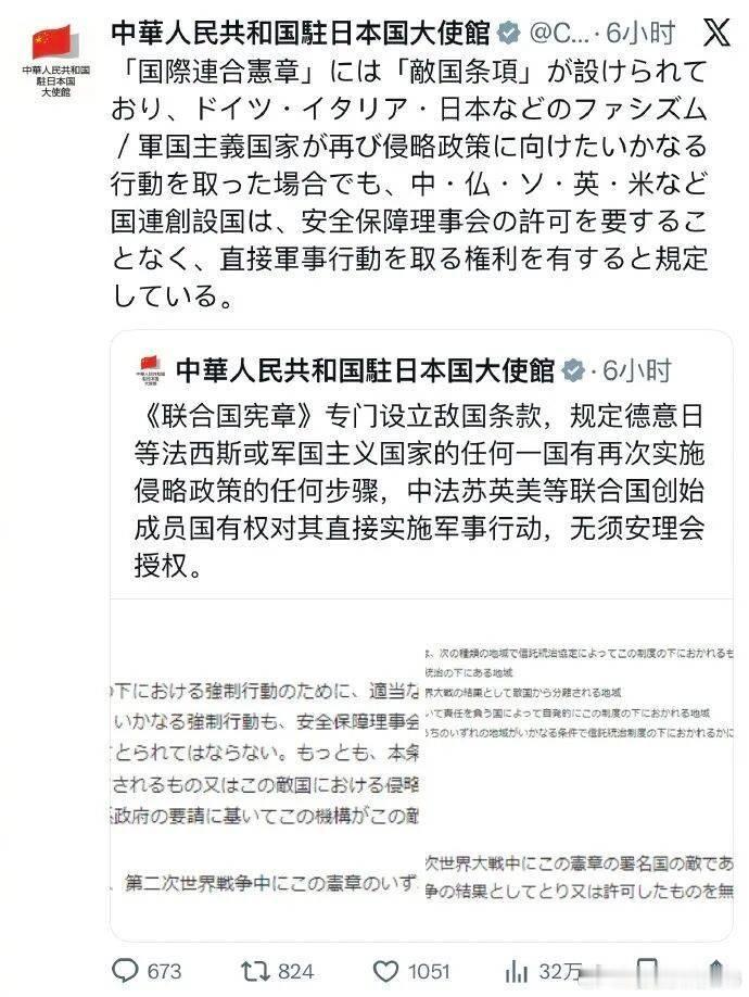 中国驻日使馆重申联合国敌国条款:若日本有再侵略的任何步骤,五常可直接实施军事行动------据环球时报,11月21日,中国驻日大使馆在社交平台X用中日双语发帖:《联合国宪章》专门设立敌国条款,规定德意日等法西斯或军国主义国家的任何一国有再次实施侵略政策的任何步骤,中法苏英美等联合国创始成员国有权对其直接实施军事行动,无须安理会授权。