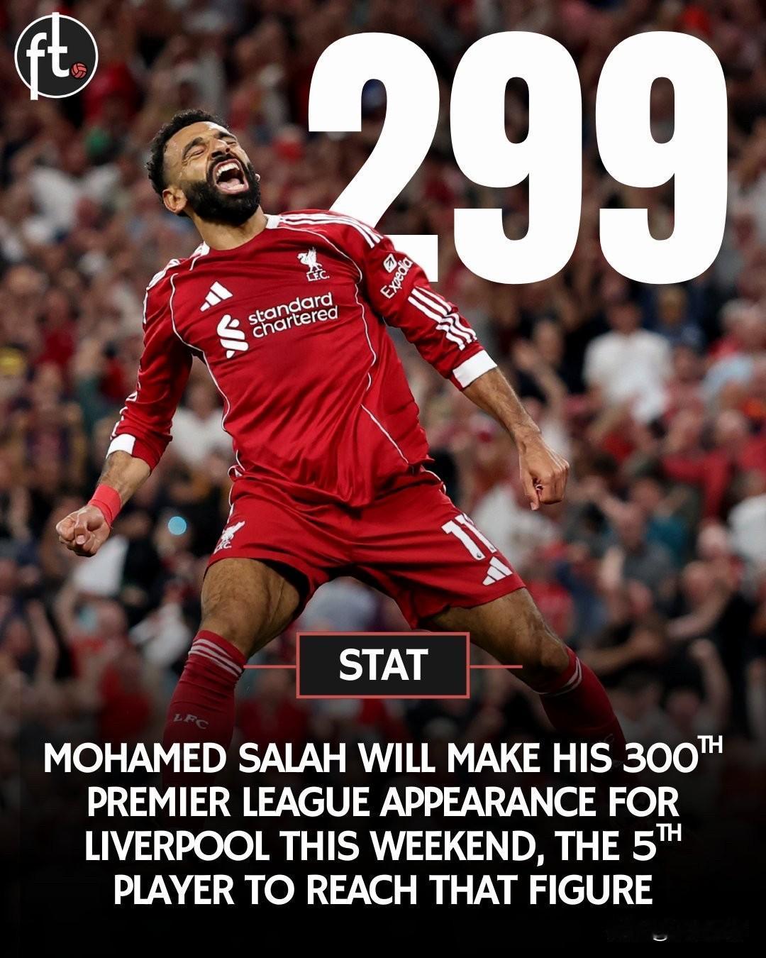 伟大无需多言! 萨拉赫本周末将代表利物浦完成其第300次英超登场,成为俱乐部历史