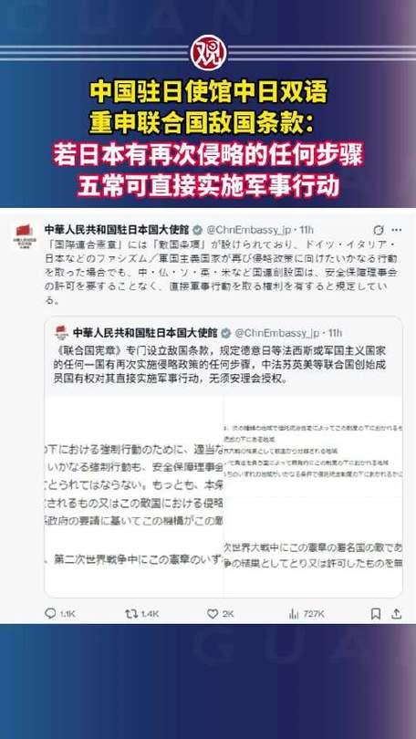 敲死红线! 中国驻日使馆 直接亮明联合国敌国条款,底线划得明明白白:日本再敢走侵略老路,五常能直接军事出手,压根不用等安理会授权。 这可不是空话,日本近年动作太跳,国防预算破战后新高,还砸钱搞西南诸岛作战部署,甚至跟着喊“台湾有事即日本有事”,公然越界。 现在法理利剑悬头顶,再敢乱蹦,五常随时能出手遏制。日本右翼急着叫嚣却拿不出反驳依据,心里早慌了,这波法理亮剑,就是要断了它复活军国主义的念想!