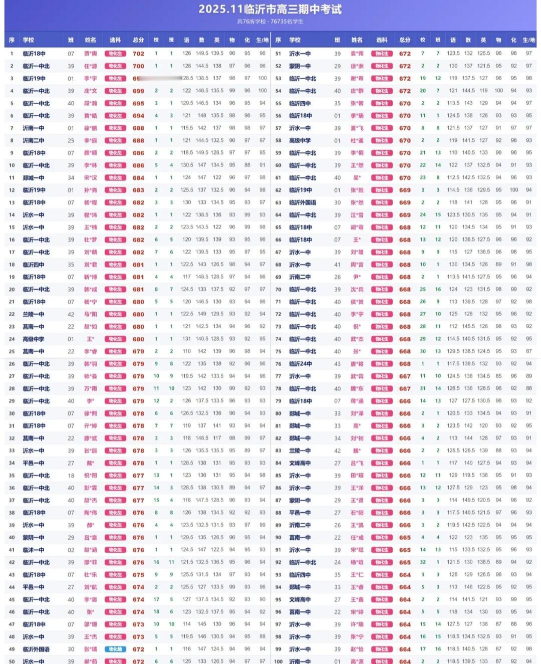 网传临沂高三期中统考前100名名单,临沂一中北校区占了三分之一,捍卫了临沂最强高中的地位。十八中有十二人,十九中3人,说明罗庄教育一如既往的强。沂水一中也是12人,依然是九县中断崖式领先。 临沂一中这届高三是第一批强基班,可以说掐尖用处还是很大的,正像衡水高中不能全省掐尖后清北人数大幅度下降一样。说明好成绩不是教出来的,是掐尖掐出来的。 不过这张表上的成绩,与我了解的部分学生成绩有点出入,差个一两分,三四分的样子,不知道是何原因。