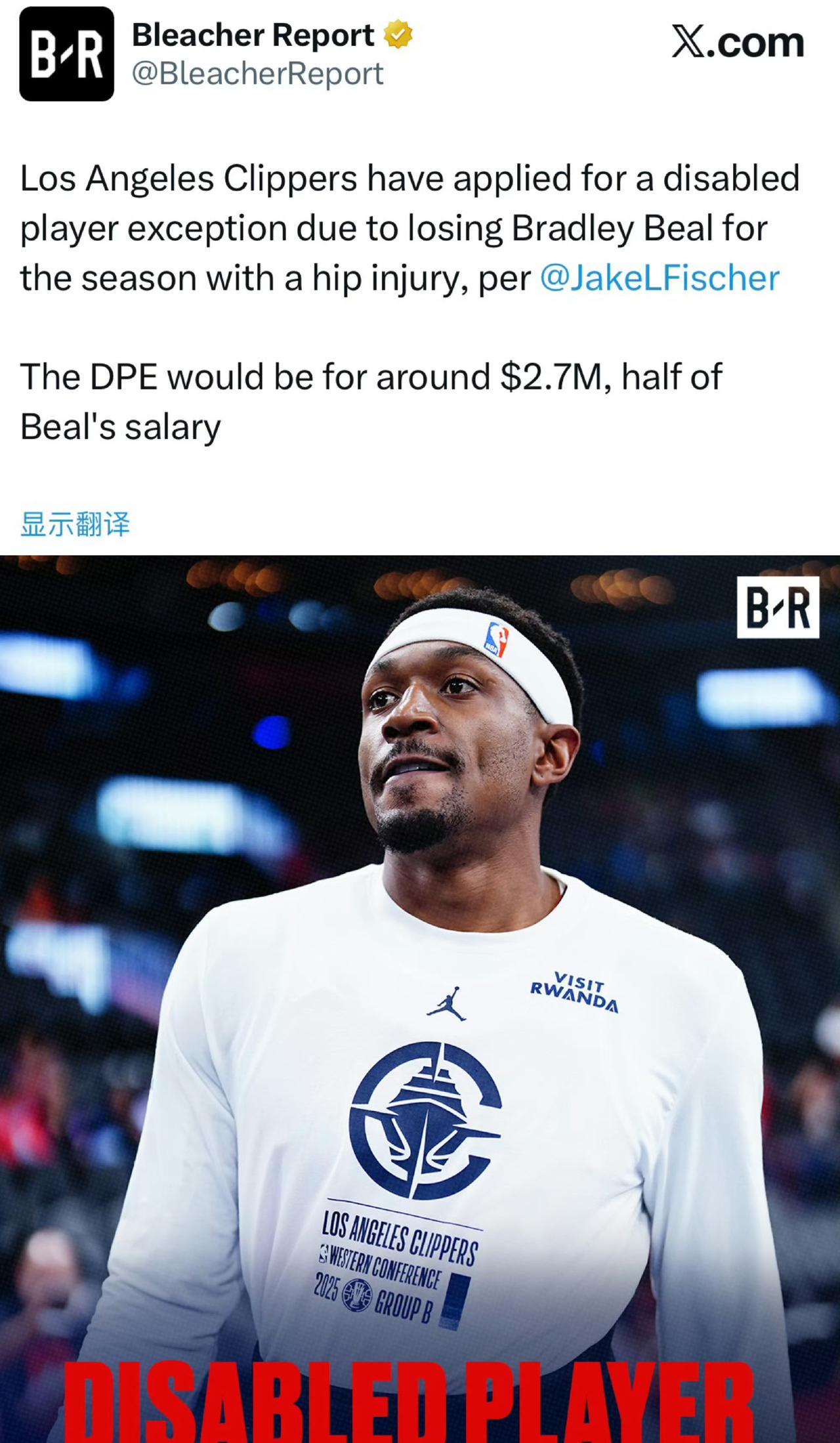 Jake Fischer:快船队因比尔髋部受伤赛季报销,已申请伤病特例。