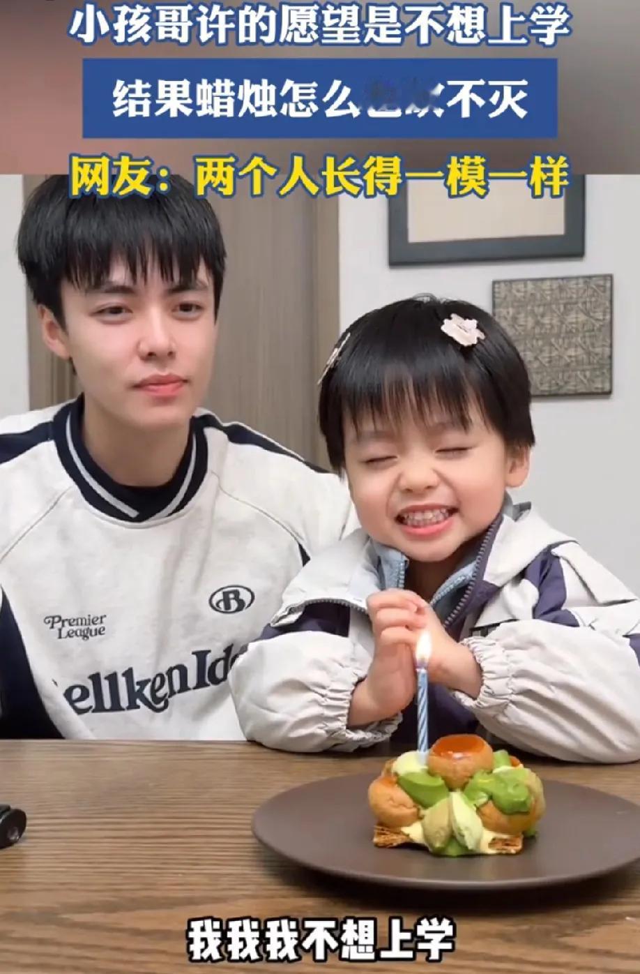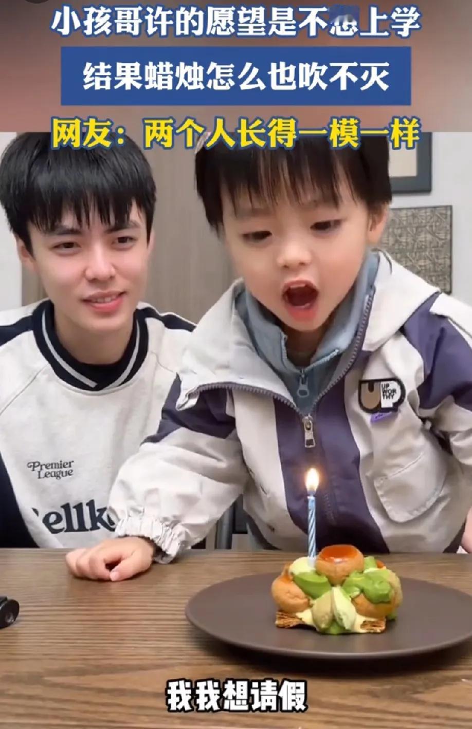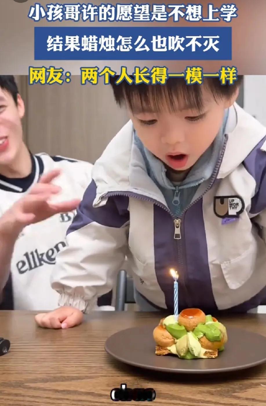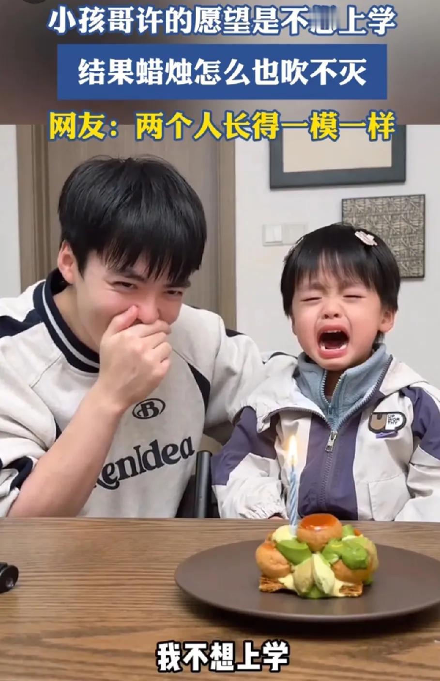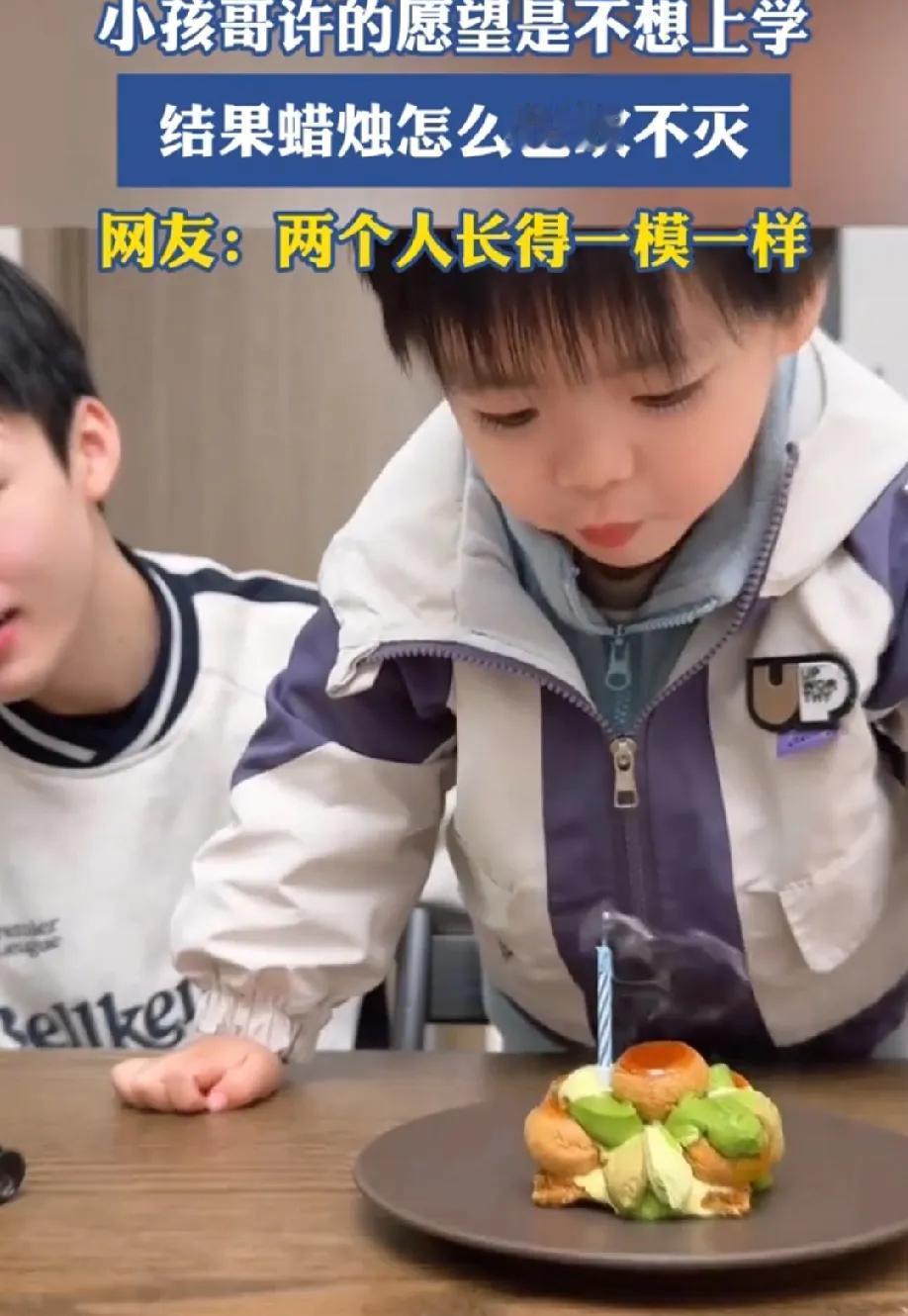 老天爷说这个愿望太大,实现不了。 一小孩哥许的愿望是不想上学,我想请假,然后吹蜡烛。小孩哥用力吹了两次,好不容易蜡烛吹灭了。一秒不到,蜡烛又重新燃了起来。小孩哥瞬间崩溃了,气得打了一巴掌爸爸,然后嚎啕大哭,大喊我不想上学。 看着小孩哥哭得那么伤心,我却不厚道的笑了!这个愿望太大了,蜡烛承受不住,换一个吧。小孩哥太可爱,看来大多数小朋友小时候都不想上学。 这就是现实版的希望有多大,失望就有多大!哭完,擦擦眼泪,上学去吧,小孩哥!