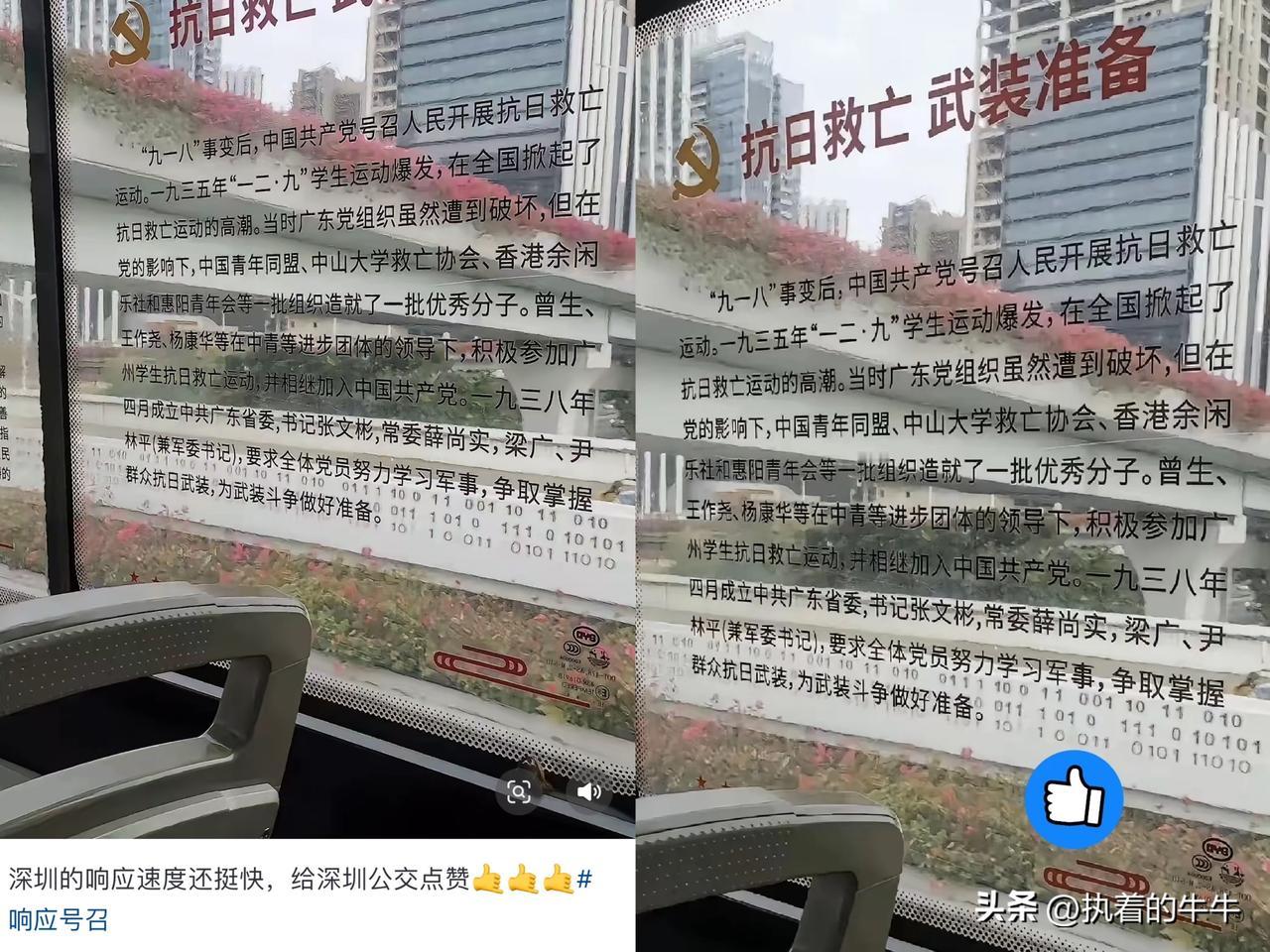 被深圳公交感动了, 他给全国所有的公交提了个醒, 爱国可以这样做! 这两天深圳的公交车上贴出了宣传正能量的信息,展现了深圳人民和深圳当局的大担当、大格局、大情怀! 和其他地方到处贴广告、贴娱乐信息不同,深圳公交这波操作,是把“正能量”焊在了移动的城市窗口上!既守得住城市温度,也扛得起社会担当,这波必须给深圳政府和公交人狠狠点赞! 网友点赞说:深圳公交的暖心举动太圈粉!危难时显担当,用实际行动传递正能量,这样的温暖值得全网点赞转发~ 有人说和平年代,抗日救亡不合适,但我们就是要让国民知道,不忘历史,今天的快乐生活是前辈给打出来的,你们说深圳做得对不对? 你们说深圳值得全国14亿人点赞👍吗?