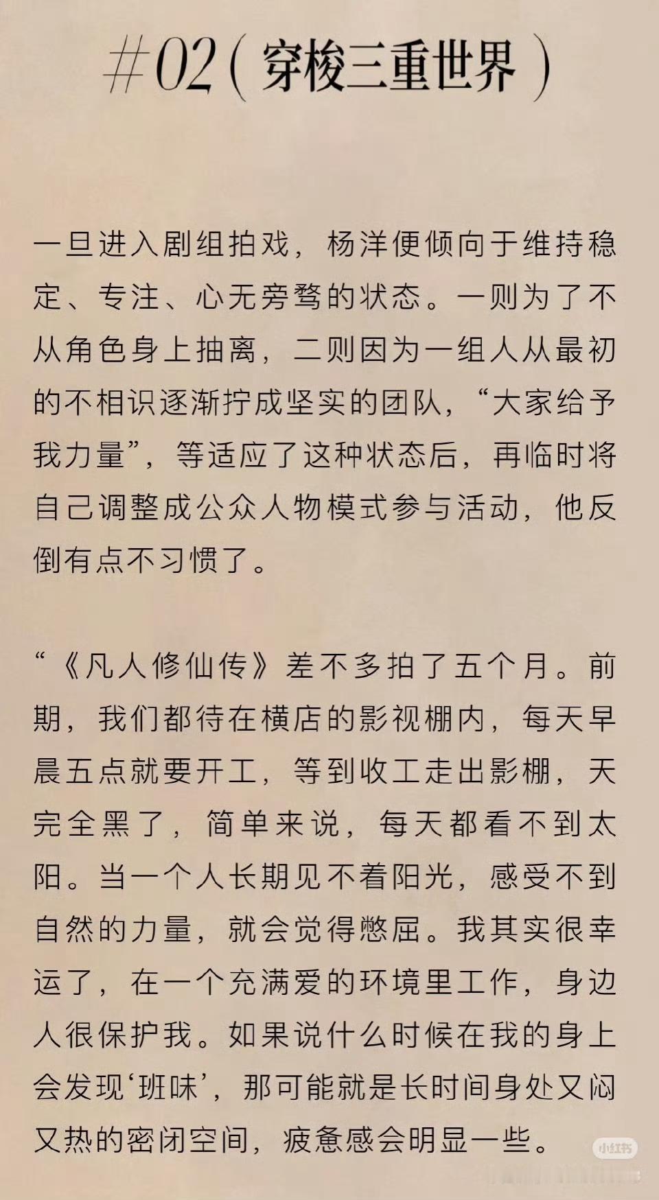 在🍠刷到一个帖子,说杨洋越安静越有内容,感觉自己又一次被小羊的魅力戳中了。其实粉丝和他对话有限,更多的时候是通过采访来认识他、了解他,这个过程总能感受到他内敛中迸发的强大的力量。就像图一老师说的,对于“标签”他可以回应但也不会主动提及卖惨,于气定神闲中坦坦荡荡。他话少,采访的底色更像是一个老派演员,含蓄、专注、逻辑情绪甚至有点小小严肃,基本上围绕工作展开。可身上有内娱少有的“侠气”和“矜傲昂扬的少年气”,所以总会不经意溢出钻石的火彩 。十几岁的他说如果有一千万全部捐给剧组,三十岁的他说演戏是他一生要专注的根,这份热气腾腾的爱是跨越十几个春秋的最纯粹的感情。杨洋通过这些再平常不过的琐碎日常告诉我最朴素的逻辑,梦想是那么美好的事情,五彩斑斓又至纯至净,比珍珠还夺目。很多人说专注作品,可你问如何做到又无从谈起,要么长期沉浸综艺,要么无缝进组,要么一个角色的羊毛薅一辈子。只有杨洋真正做到了,哪怕这个内娱对美人更加严苛,他也一次次用最牛逼的作品来回应,他磨练角色的时间和最终呈现的效果是呈正比的,给自己、给粉丝甚至给观众更珍贵的馈赠。他的作品就像照妖镜,让妖魔鬼怪无处遁形。再看这场漫长的得失,演技、美貌和人品不会骗人,公道自在人心,少年守本而已。也只有杨洋这样纯粹的人儿,才会拥有至纯至净的能量,生出如此漂亮的脸蛋儿。不笑的时候凌厉,是明月高悬,而笑的时候温暖,是治愈的小太阳。我是贪心的,想他拥有的更多,又不想他失去自由,想所有的伤害都给他一个说法。可于他而言,不过尔尔,作品是初心,守心即可。