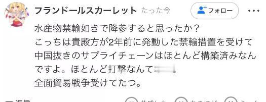 重磅新闻!中国再次停止进口日本水产品。   值得注意的是,芙兰朵露·斯卡蕾特:日本人已经建立了一条不依赖中国的供应链,已经做好了全面贸易战的战斗准备。希望小日子说到做到,千万别怂。其经济一定会比现在的欧盟还要惨。   日本渔业跟中国市场的绑定程度,早就到了“唇亡齿寒”的地步。咱们先看看最直观的出口数据,中国一直是日本水产品最大的海外市场,没有之一。   2024年的数据显示,日本全年出口的水产品里,有近三成是卖到中国的,光这部分的销售额就占了日本水产出口总额的28%。像扇贝、金枪鱼、鳗鱼这些主打品类,中国市场的占比更是超过四成。   很多人不知道,日本北海道的渔民大半收入都靠往中国卖扇贝,去年因为抽检问题暂停进口那几个月,当地扇贝价格直接暴跌三成,不少渔户连渔船维护费都凑不出来。   说什么“不依赖中国供应链”,先问问北海道那些靠中国市场吃饭的渔民答应不答应。   再说说日本所谓的“替代供应链”,他们这两年确实在往东南亚和欧美市场使劲,但效果实在不敢恭维。东南亚国家本身渔业资源就丰富,自己家的海鲜都吃不完,对日本水产品的需求有限。   2024年日本对越南、泰国的水产出口额加起来还不到对中国的五分之一,而且这些市场对价格特别敏感,日本海鲜一旦涨价就没人买,反观中国市场不仅量大,还能接受中高端产品的定价。   欧美市场更不是那么好啃的骨头,欧盟有严格的食品安全检测标准,日本很多水产品因为养殖过程中的药物残留问题,多次被欧盟拒之门外。   去年日本输欧的鳗鱼就因为检出呋喃西林,被欧盟通报并暂停进口,损失了近千万欧元。美国市场虽然宽松点,但本土海鲜产量大,日本产品想挤进去就得打价格战,最后利润薄得像纸。   日本水产厅自己也承认,过去三年花了近百亿日元搞“市场多元化”,但对中国市场的依赖度只降了不到3个百分点,所谓的“不依赖”不过是自欺欺人的说辞。   更关键的是,日本水产品产业链早就跟中国深度绑定,不是说断就能断的。日本很多水产加工企业的原材料采购、加工环节都依赖中国。   比如日本市面上卖的冷冻鱿鱼,有六成是在中国山东、辽宁等地加工的,因为中国的劳动力成本比日本低三分之二,加工效率还高。要是真跟中国搞贸易战,这些加工企业要么就得承受成本暴涨,要么就得关门大吉。   还有日本的水产饲料,大部分豆粕、鱼粉都是从中国进口的,中国一旦停止供应,日本水产养殖行业就得面临饲料短缺的危机,到时候连本土的海鲜供应都得出问题。   去年就有日本养殖协会发出警告,要是失去中国的饲料供应,日本三文鱼养殖产量得减产四成,市场价格可能翻倍。   那些喊着“全面贸易战”的人,怕是没算过这笔账。日本经济现在本来就处在低迷期,2024年GDP增速才1.2%,负债率超过260%,根本经不起折腾。   水产行业虽然不是日本的支柱产业,但直接关系到数百万渔民和相关从业者的生计,一旦这个行业出问题,很可能引发连锁反应。   去年中国暂停进口日本部分水产品后,日本水产行业就出现了一波倒闭潮,近百家中小型水产企业因为订单锐减而破产,失业率也跟着上升。要是真搞全面贸易战,这个数字只会成倍增加。   反观中国,早就做好了应对准备。中国本身就是渔业大国,2024年水产品产量达到6900万吨,占全球总产量的三分之一,完全能满足国内市场需求。   而且中国的水产供应链非常完善,从养殖、加工到销售形成了完整的产业链,就算不进口日本水产品,老百姓的菜篮子也不会受影响。   这些年中国还在积极拓展其他进口渠道,从俄罗斯、挪威、秘鲁等国进口的水产品份额逐年增加,已经形成了多元化的供应体系。   日本想靠所谓的“不依赖中国供应链”来威胁中国,根本就是打错了算盘。贸易战从来都不是单方面的,日本要是真敢铤而走险,受损的只会是自己的经济和民生。   那些鼓吹“战斗准备”的言论,不过是虚张声势罢了。真到了动真格的时候,最先撑不住的恐怕是日本自己。毕竟中国市场不是说丢就能丢的,供应链也不是说建就能建的,这些都需要时间和金钱,而日本现在最缺的就是这两样。   中国停止进口日本水产品,本质上是为了保障国内消费者的食品安全,这是无可厚非的正当举措。日本与其花心思搞什么“供应链自主”,不如好好反思一下自己的食品安全问题,要是能拿出让人信服的检测报告,解决核污染水排放等关键问题,市场自然会回来。   要是一味地嘴硬,甚至想通过贸易战来施压,最终只会搬起石头砸自己的脚。经济规律从来都不会说谎,谁脱离了最大的市场,谁依赖着别人的产业链,结果早就注定了。