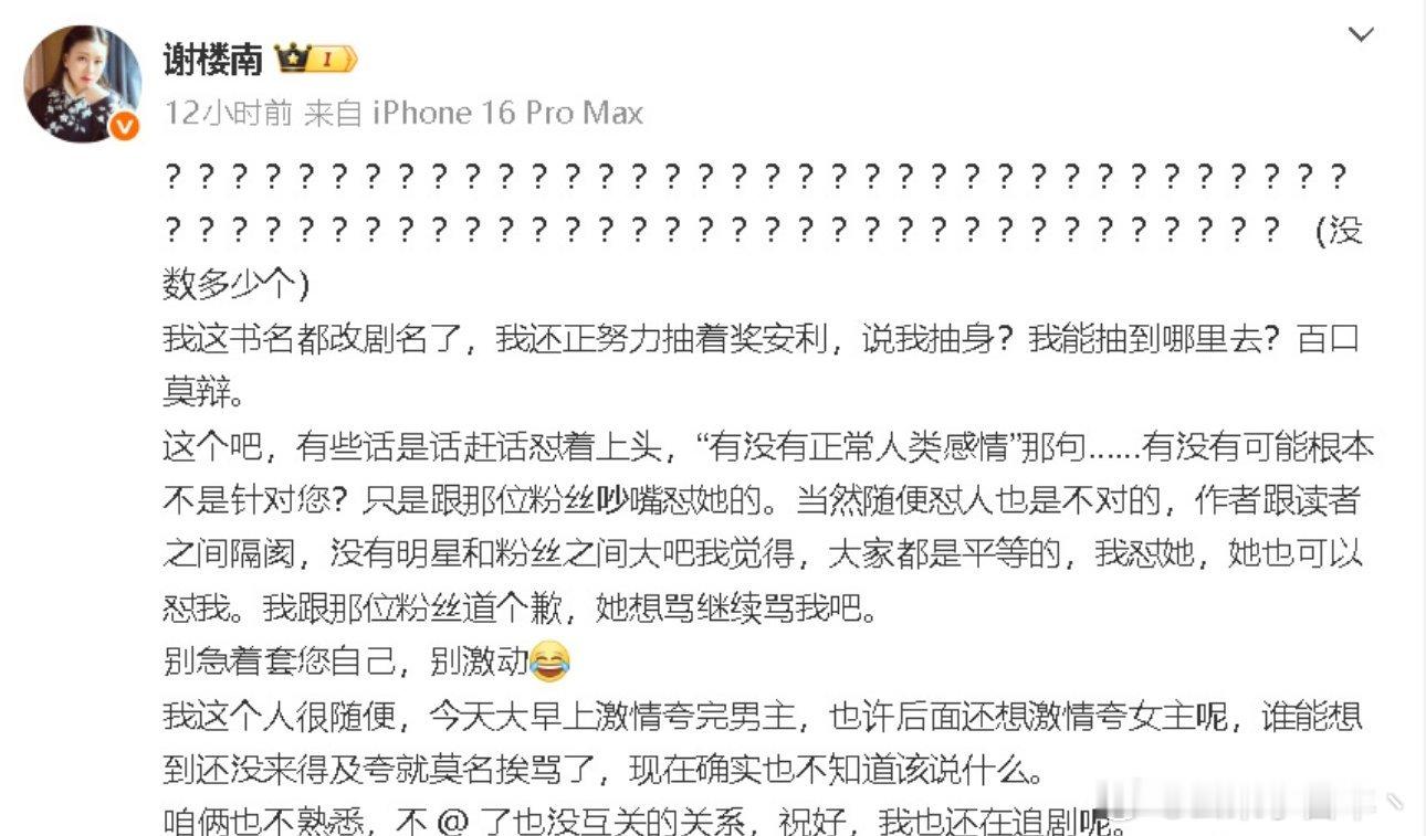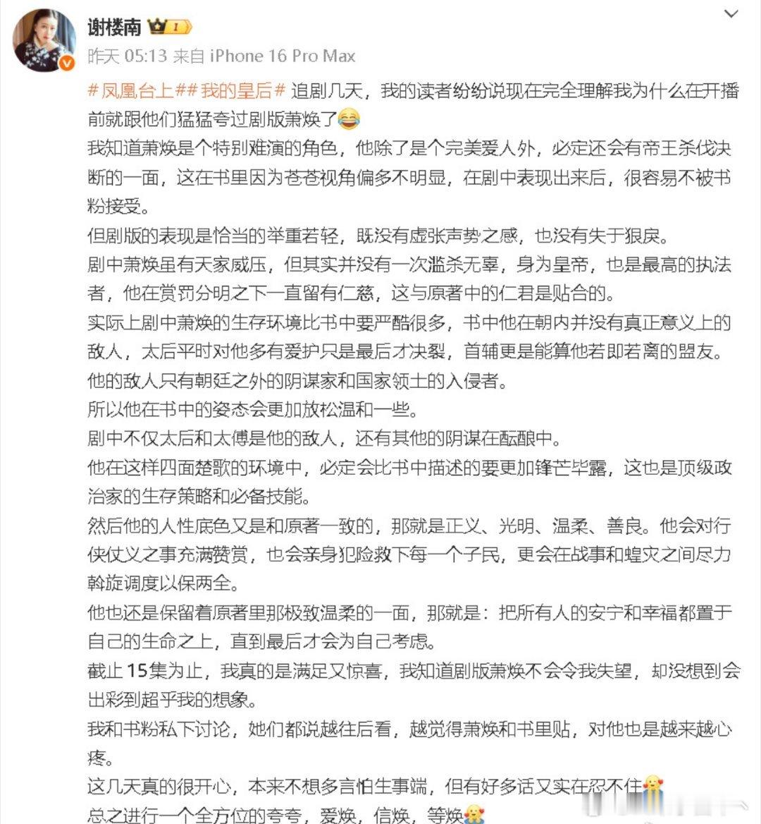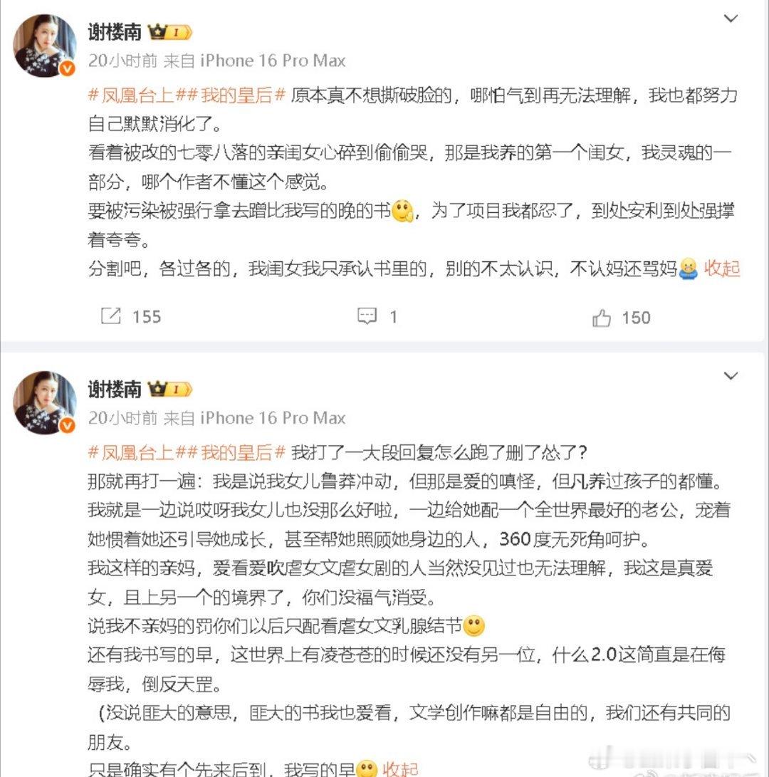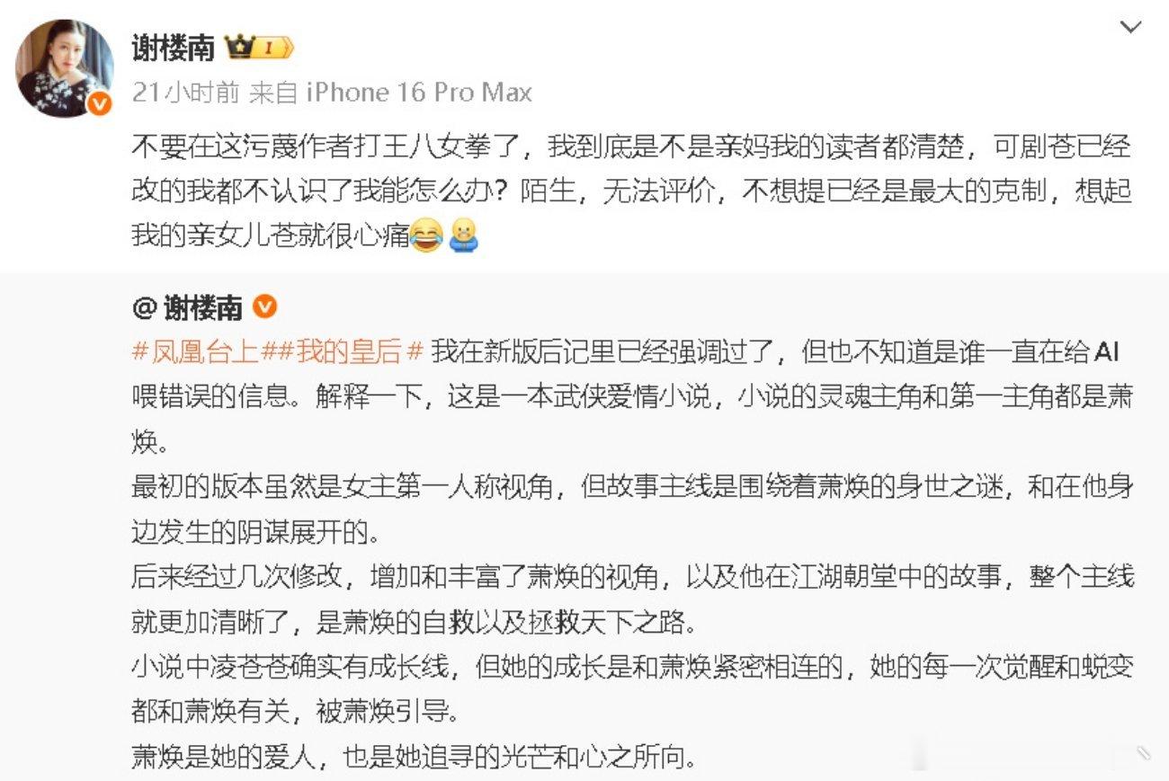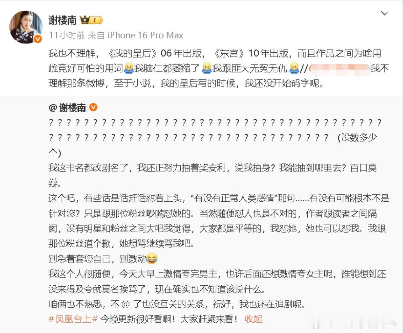 近日《凤凰台上》开播,有不少网友称该剧集某些部分像《东宫》。19日,原著《我的皇后》作者 发文强调该作品早过前些年拍成剧的小说;21日,谢楼南转发网友热议,称剧情有修改,希望观众看原著:“剧改我只能说大家不要激动冷静看待,还有我无法替编剧演员作答。”此后她又发文表示剧集里的凌苍苍已经改得她都不认识了:“不想提已经是最大的克制”、“我闺女我只承认书里的,别的不太认识,不认妈还骂妈。”21日晚,剧版凌苍苍扮演者 发长文回应,称像《东宫》的感受不应该被捂嘴,喊话创作者不要“雌竞”;表示凌苍苍人设不是演员能决定的,基调是按剧本来,透露一开始只有10集剧本,后来也只有一集定稿剧本,之后是边拍边收到剧本;回应谢楼南对改编失望,希望她不要在剧播期间激烈吐槽:“剧没播完,我们是一条船上的”;回应谢楼南“有正常人类感情吗您?能共情角色吗您?”的言论,彭小苒说好不好看,观众自有判断;最后,彭小苒表示:“成绩好的剧,所有的创作者一定是大家都互相抬着 护着,互相给体面给尊重,大家团结在一起去找共鸣,求同存异也紧密团结。”彭小苒发文后,谢楼南再次发文,配上许多个问号,称“有正常人类感情吗您?”的发言不是针对彭小苒,“咱俩也不熟悉,不@ 了也没互关的关系,祝好,我也还在追剧呢。”“其实不太愿意想起来,总觉得是有些伤心的,就是真心错付,惨遭背刺吧。”