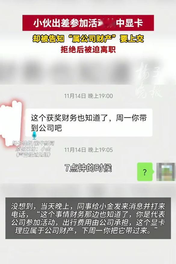 上海,男子和同事受公司安排,一同到苏州参加英伟达的活动,同事嫌麻烦便没有参与现场的抽奖,而男子则趁上厕所的间隙,去各个展位完成了盖章,获得了抽奖的资格。 没想到男子中了大奖,获得高端显卡一张,公司得知后要求男子上交,说这是公司的财产,小伙虽拒绝上交保住了显卡,但最后公司也劝退了小伙离职。   秋日里的一场常规出差,本该是职场新人积累经验的契机,却因为一份意外之喜掀起轩然大波。   上海某公司实习生小金,入职不足三月便被派往苏州参与英伟达路演活动,谁也没料到,工作间隙随手参与的集章抽奖,竟让他抽中价值3000元的GeForceRTX5060显卡。   这本该是值得庆贺的好运,却最终以他提交离职申请收场,而导火索,正是公司那句“这属于公司财产,必须上交”。   小金是8月底加入公司的职场新人,对于11月14日的苏州之行,他最初只当作一次普通的工作任务。   活动现场的集章抽奖环节,规则清晰地写着“面向现场观众个人”,每人仅限领取一张集章卡,集齐9个展位LOGO章即可参与抽奖。   趁着去洗手间的空档,小金顺手领了卡并完成了全部盖章,同行的同事嫌流程繁琐,不仅自己放弃参与,还把自己的集章卡托付给小金帮忙代集。   当天傍晚六点,开奖结果揭晓,小金成为了那份幸运的获得者。   这份突如其来的惊喜,没能持续多久就被同事的话语浇凉。   得知小金中奖后,随行同事先是提议“不如把显卡卖掉换钱”,没过多久又突然改口,声称“财务已经知道这事了,下周一必须上交公司”,理由是出差费用由公司承担,奖品理应归公司所有。   满心困惑的小金不愿轻信,11月17日特意跑到财务部门核实,结果却得知财务对此事毫不知情,所谓的“公司要求”不过是同事的单方面说辞。   同事的误导只是开端,真正的压力来自公司层面的介入。   得知中奖事宜后,公司高层迅速组织了两次专项会议,还专门约谈了小金。   谈话中,公司明确提出“这是公司安排的活动,出行费用也是公司出的,显卡属于公司财产”,要求他主动上交。   尽管没有采取强行没收的强硬手段,但谈话过程中反复暗示他“另谋高就”,字里行间的施压意味让小金倍感窒息。   在这样的处境下,这位刚入职场的年轻人别无选择,11月19日深夜,他写下了离职申请。   这场纠纷的核心,始终围绕着一个简单却棘手的问题:职场中偶然获得的运气所得,究竟该归个人还是公司?   从活动规则来看,抽奖明确指向“现场个人”,并非针对参会企业的商务馈赠,小金参与活动时也没有收到公司的明确指派,完全是利用工作间隙的自愿行为。   律师后续明确表示,这种基于个人运气的中奖,并非履行职务行为的成果,在没有任何合同约定或公司规章制度明确的情况下,奖品理应归参与者个人所有。   公司的主张看似有迹可循——出差费用由公司承担,活动是公司安排的公务。   但细究起来,出差费用本就是企业开展业务的必要成本,不能以此为由剥夺员工的个人权益。   民法典中早已明确,民事主体有权按照自己的意愿依法行使民事权利,不受干涉,而民事活动更应遵循公平原则。   小金参与抽奖既符合活动规则,也没有损害公司利益,仅因运气好中奖就被变相逼迫离职,这样的做法显然缺乏合法依据。   事件在网络上引发的讨论,呈现出鲜明的分歧。   有人直言“公司格局太小,3000元寒了所有员工的心”,认为企业的做法会让在职员工失去归属感;   也有人觉得小金“不够懂人情世故,起码该主动报备”,认为必要的流程能避免误会;   还有少数网友提出“未报备可能涉及受贿嫌疑”,但这种猜测并无任何事实支撑。   在我看来,公司要求小金上交显卡的做法实在不妥。   抽奖活动明确面向个人,小金凭运气中奖,却被告知“属公司财产”要上交,这本身就违背了公平原则。   职场中,规则与边界本应清晰,企业不能因为自身承担了公务成本,就随意侵占员工的合法权益,更不能用变相离职的方式施压。   而对于职场人来说,遇到类似情况时,留存好抽奖规则、沟通记录等凭证至关重要,必要时可通过法律途径维护自身权益。   这场因显卡引发的纠纷,不仅是一次简单的归属争议,更提醒着企业与员工:尊重规则、明确边界,才是职场良性发展的基石。   今天的分享到这里就结束了,大家对此事有何看法,欢迎在评论区留言和讨论,感兴趣的可以点击头像加关注,我将每日更新优质内容,我们下期见。