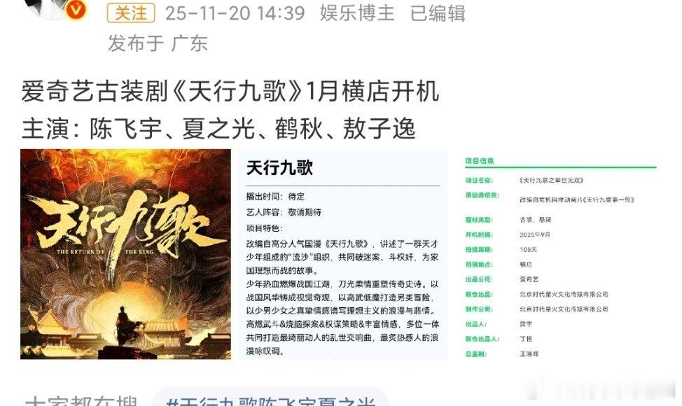 《天行九歌》这个剧和陈飞宇其实挺适配的大男主剧,ip也不小,男频又是阿瑟的舒适区这个剧现在内部评级还不错,韩非人设非常好,一个巨大的美强惨故事。《天行九歌》男主就是所有人的白月光,这个角色很容易吸粉,《秦时明月》里活着的人都把他当白月光