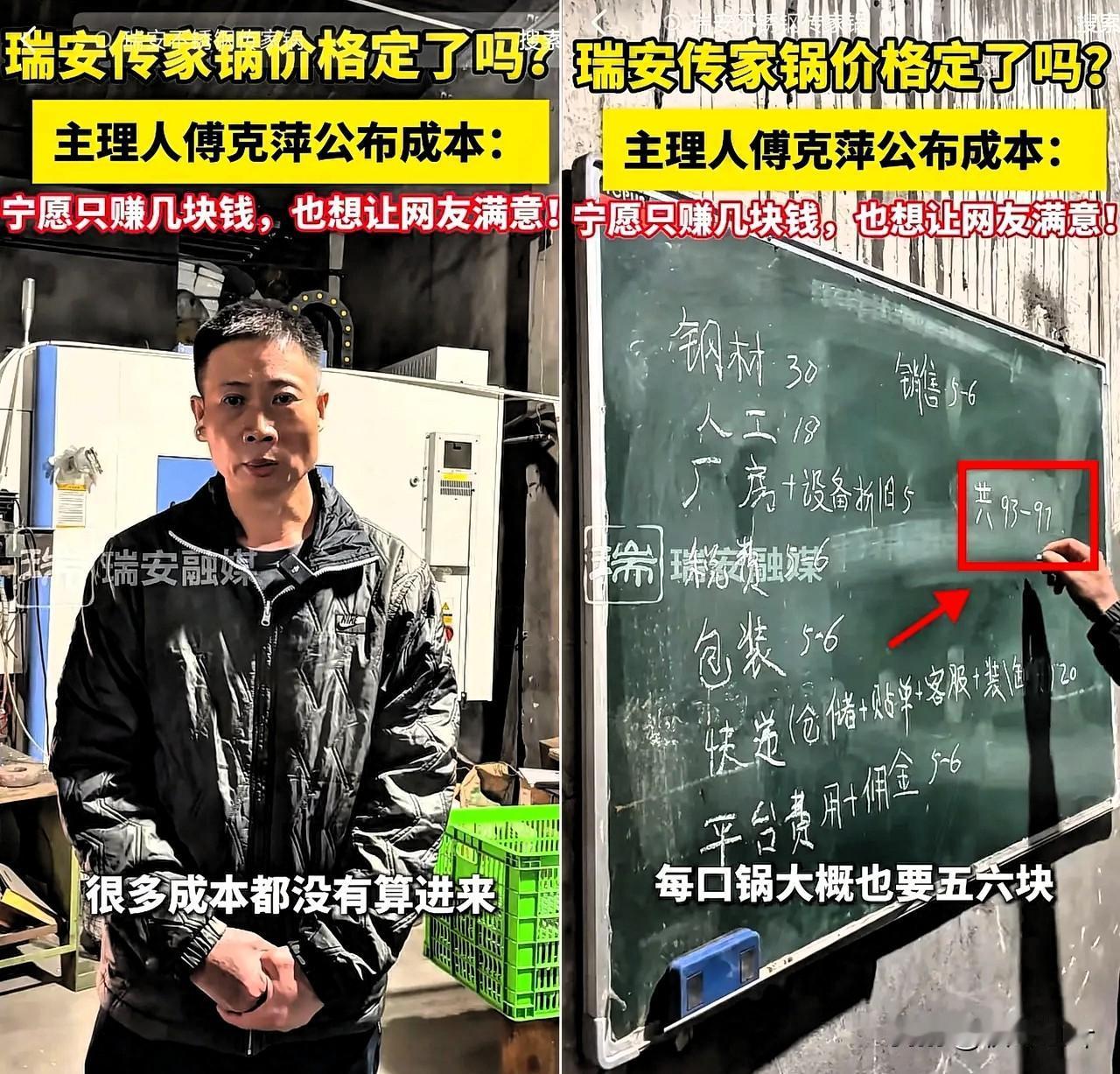 瑞安传家锅的价格出来了,可能要让很多人失望了! 老板最初提到50多元的定价,确实是没充分考虑到后续的隐形成本。实际核算后才发现,光食品级304不锈钢的原材料和人工成本就占了48元,再加上包装、物流运输、平台佣金,还有各项杂费和税费,综合成本已经达到93-97元。 最终定99元的价格,基本没什么利润空间。亲戚都劝他适当提价减少损失,但他不想辜负网友的期待,还是决定硬着头皮按这个价格出售,这份对信任的珍视,比单纯的低价更让人觉得踏实。 现在的锅具市场选择很多,但也存在不少问题:有些产品材质标注模糊,却靠着营销卖高价;有些看似低价实惠,实际偷工减料,用着让人不放心,消费者踩雷的情况并不少见。 而瑞安传家锅明确使用食品级304不锈钢,材质有保障,老板还省去了中间商加价的环节,把成本透明化,让消费者能清楚知道钱花在了哪里。 大家一开始的“失望”,更多是源于心理预期的落差。但理性来看,99元能买到材质靠谱、安全放心的锅,比起那些看似便宜却不耐⽤、有健康隐患的产品,其实更划算。“一分钱一分货”的道理从未过时,消费的核心终究是物有所值,而不是单纯追求低价。 商家想要长久经营,真诚和靠谱才是关键。瑞安传家锅老板不玩套路、公开成本的做法,不仅守住了经营的底线,也契合了消费者对“明明白白消费”的需求。网友从最初的讨论到后来的理解,也说明大家真正在意的,是产品的品质和商家的诚意。