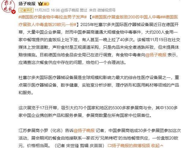 德国医疗展,盒饭20欧元一份,致200名中国人中毒! 据报道,2025年11月17日德国杜塞尔多夫国际医疗器械设备展期间,中国参展商遭遇大规模食物中毒事件。大约200人食用20欧元一份的盒饭后,出现上吐下泻,有人甚至一晚上拉了40多次,初步估计受影响人数超过100多人,未出现重伤或死亡情况,具体原因德国当地食品安全局已在进行调查中。 然而,令网友疑问的是,几百家参展商,为什么唯独是中方参展商出现食物中毒?是巧合吗?一定要调查清楚,严惩责任人,维护中国人的合法权益。德国医药展 食品中毒 餐厅食物中毒