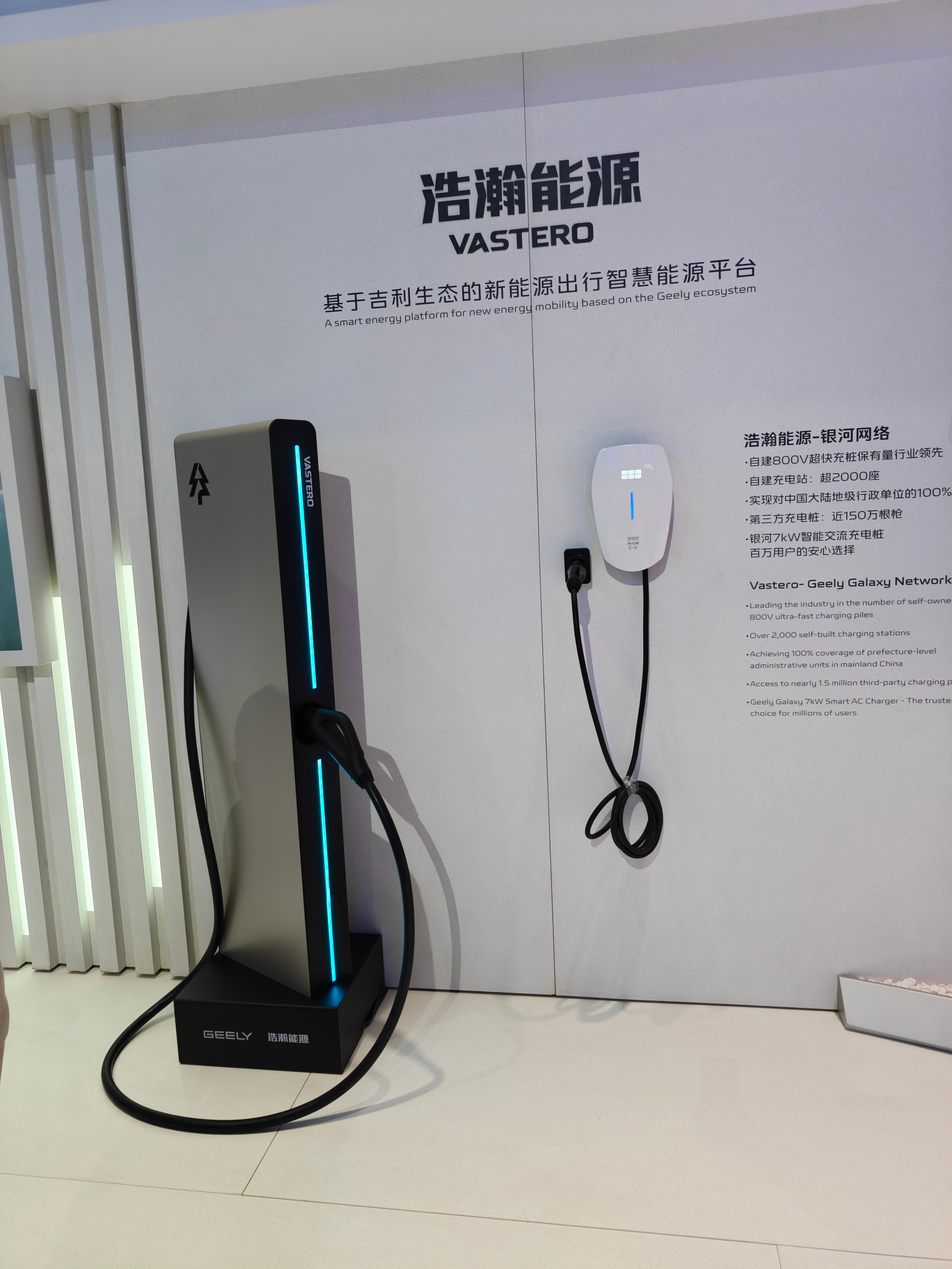 这个是吉利展台上第一次公开亮相的浩瀚能源!是从之前的极氪里头单独剥离出来的一个独立公司,那么现在它也包含着极氪能源的一些充电桩,目前在市面上看到的所有极氪的能源,应该都是属于这家公司底下的~浩瀚能源的充电桩看着还是挺精致的,但是整个充电枪和充电线的重量相比于理想的5C还是差点意思。相比于极氪自己的桩呢,它的线会更长。我也问了,后续他们会对大吉利集团的一些纯电车子加上私有协议,充电会更快。他们也考虑在明年会在高速上铺装建设,这个是个好事儿