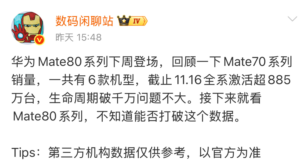 据战哥爆料Mate70系列,全系销售量破885万台,Mate 80系列马上就要登场了,也不知道它的生命周期能不能超越这个数据!