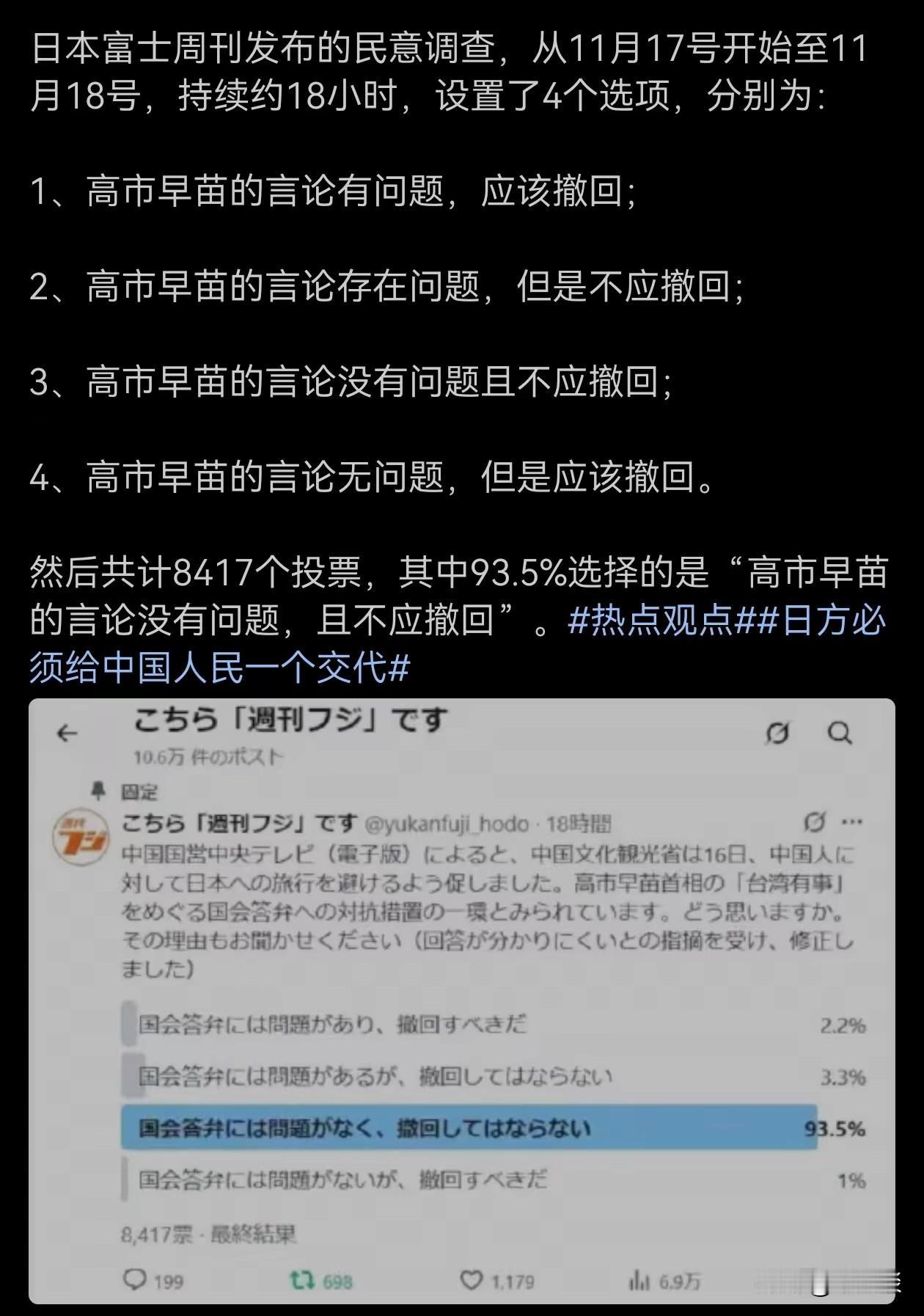 大雪崩塌没有一片雪花是无辜的。日本曾经遭受原子弹轰炸,日本人是无辜的吗?看看高市早苗台湾言论在日本国内的支持度实在让人心惊胆战,根据某媒体调查,高市早苗的言论在日本国内获得了 93.5% 的支持率。高市早苗的干涉我国内政言论在日本如此有市场,绝对不是一天两天的事情,是日本整个国民对二战战败的反抗,也是日本国民企图摆脱战败国阴影!