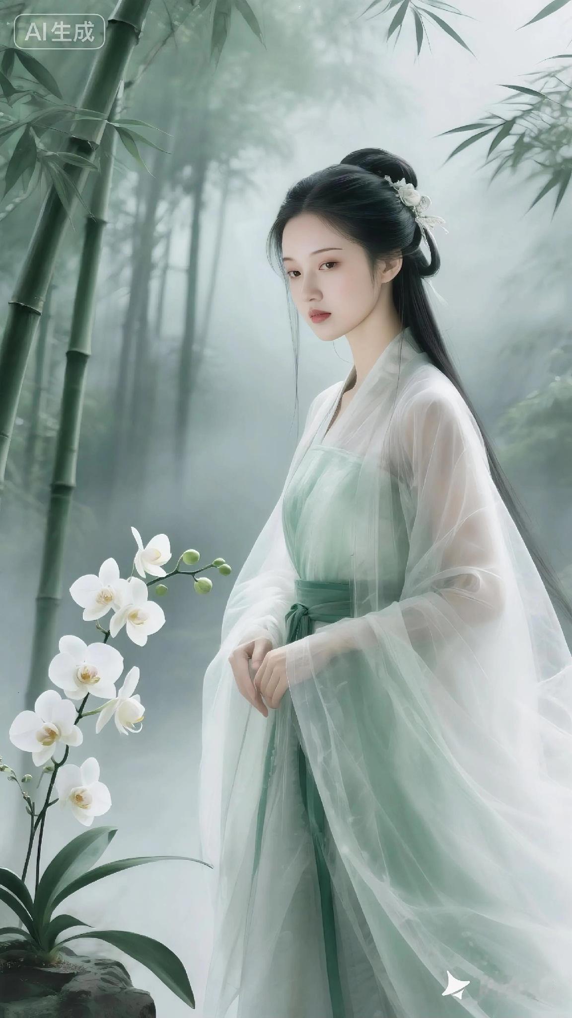 竹雾裹青衫,兰香落鬓边。 山风偷渡处,云影化春颜。