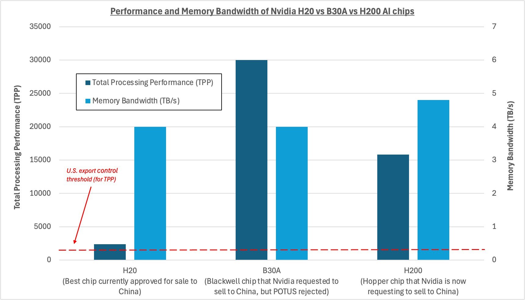 这张图,红色虚线代表美国目前的出口管制红线。¹ 目前,H20芯片已经放行,H200可能将要放行。取决于特朗普能不能说服国会。² B30A是基于更先进Blackwell架构的AI芯片,一度说要放行还是没放。但按商务部长卢特尼克说法,可能未来一两年再放。