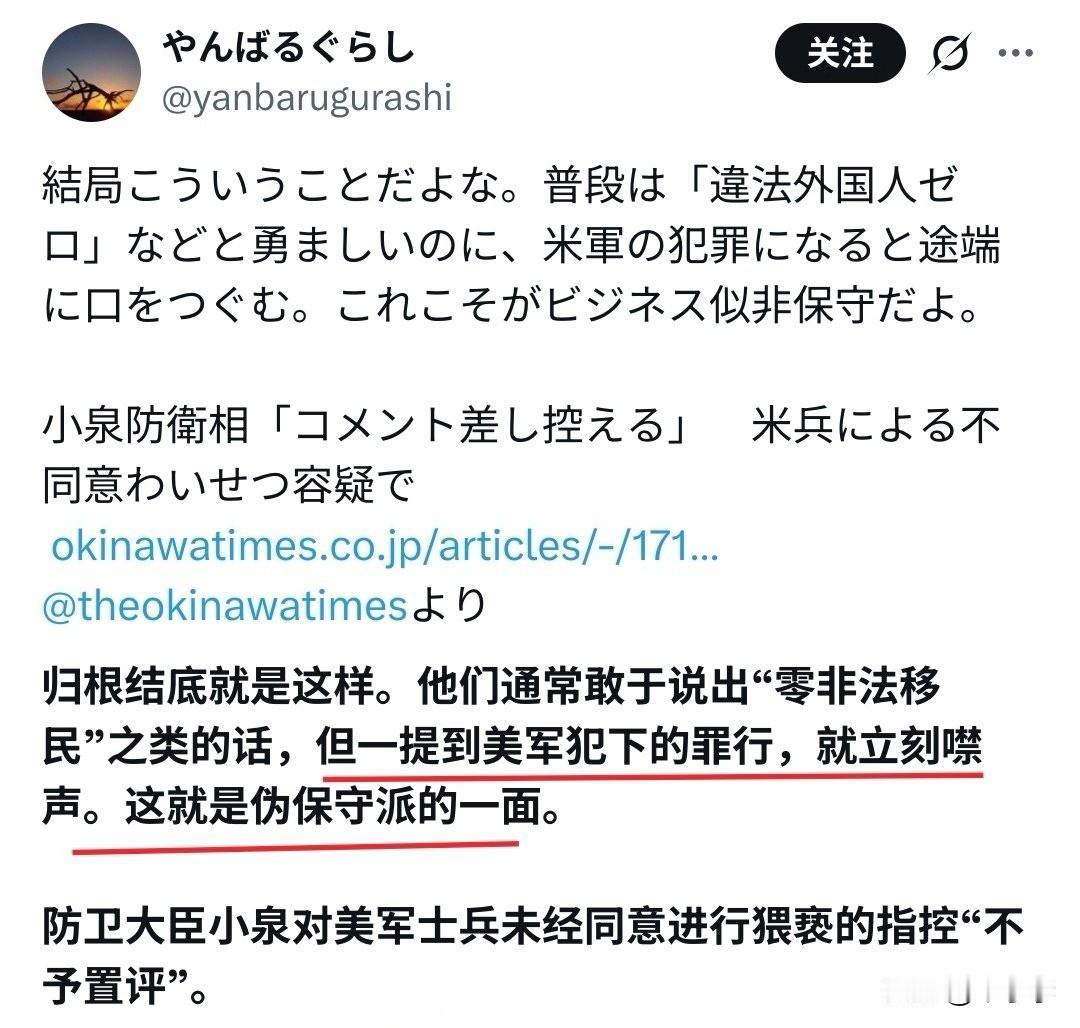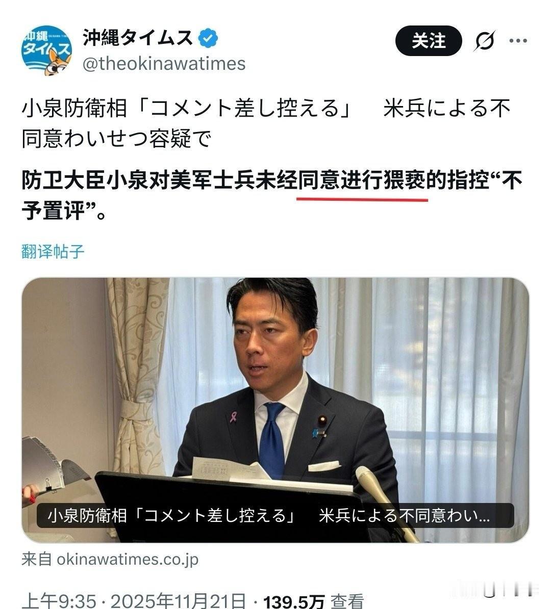 日本防卫大臣小泉对美军士兵“未经同意进行猥亵”的指控“保持沉默”。 什么叫“未经同意的猥亵”,难道日本还有“经过同意的猥亵”? 哎呦喂,敢情不是被猥亵女子冤,而是美军大人冤啊[摊手]妇女猥亵 小泉的政绩 日本小泉 做好服务,让美国大兵高兴是你们应尽的义务!