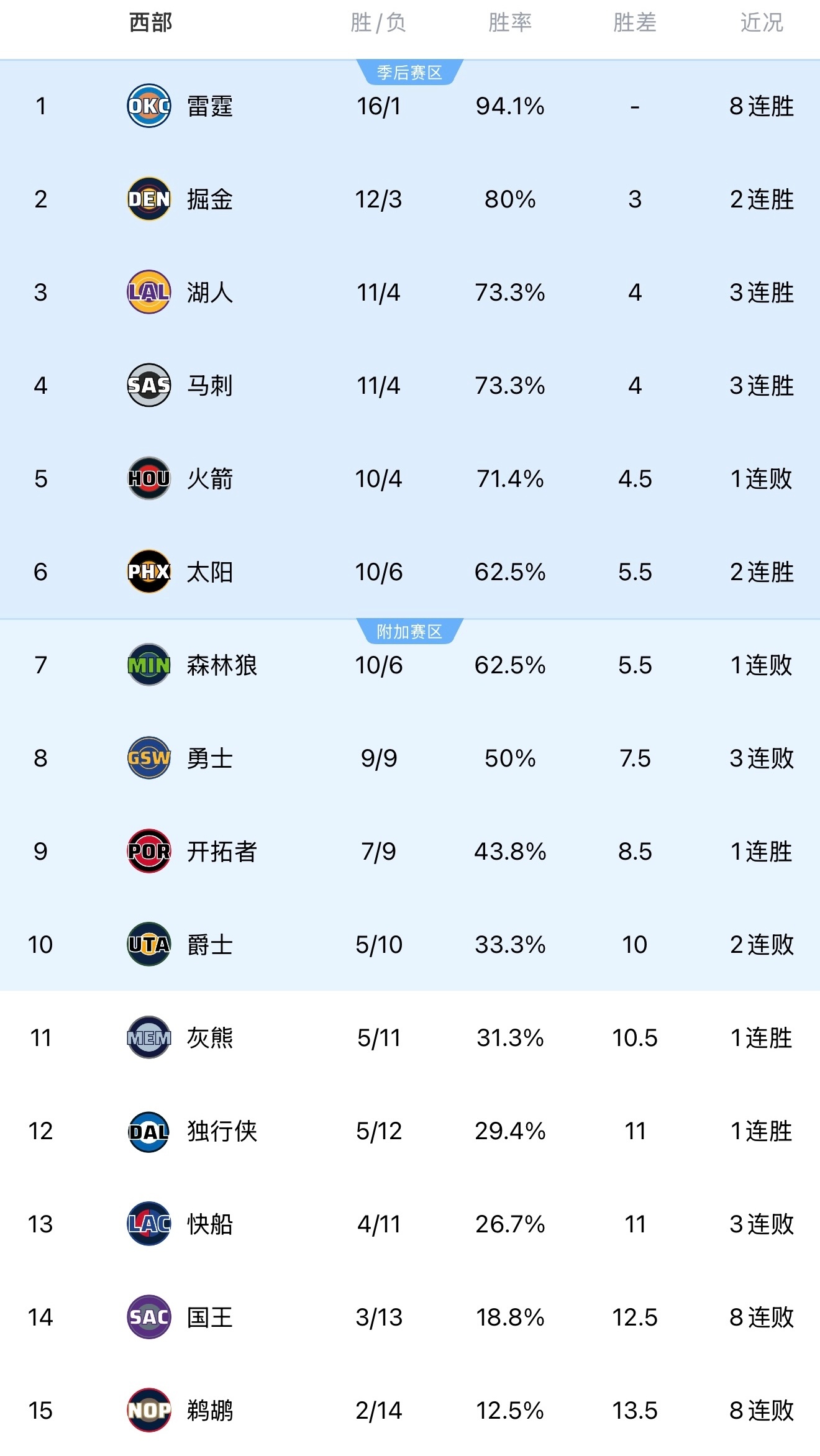 👀最新西部排名,没有比赛的湖人升到西部第三。
