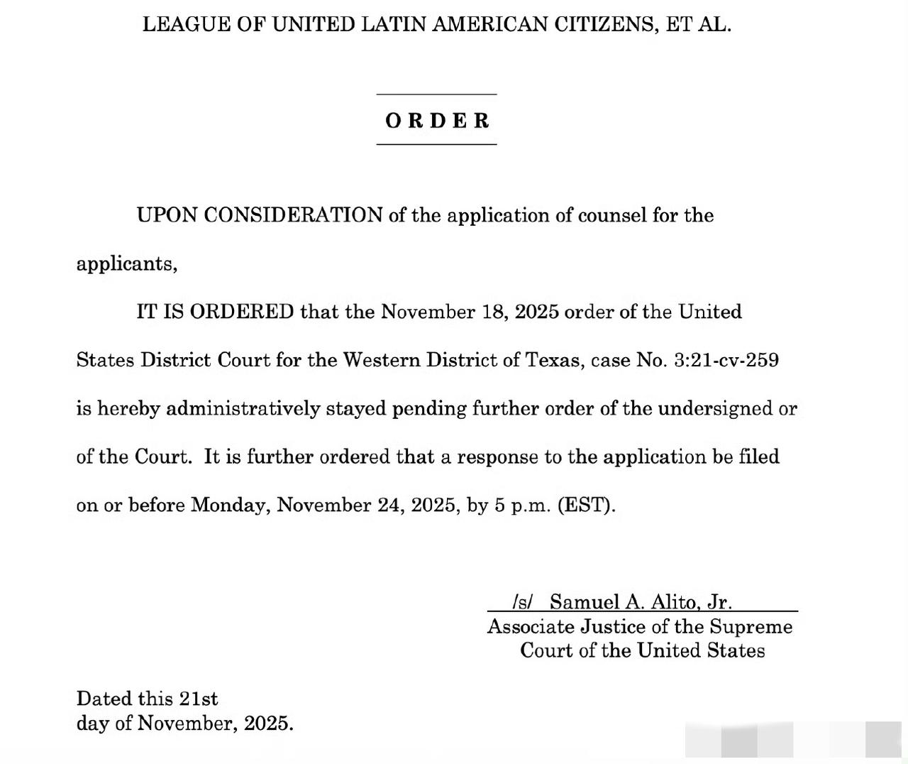 看来德州的选区划分差不多了!美国最高法院立即推翻了激进法官此前否决德克萨斯州2026年国会选区划分方案的裁决。该方案对共和党有利。 大法官萨姆·阿利托发布了这项命令。目前,该选区划分方案已恢复生效,最高法院正在正式审理此案的上诉。 中期选举在即,三个重要的选区划分,德州,佛州,加州。前两个有利于共和党,后一个有利于民主党。
