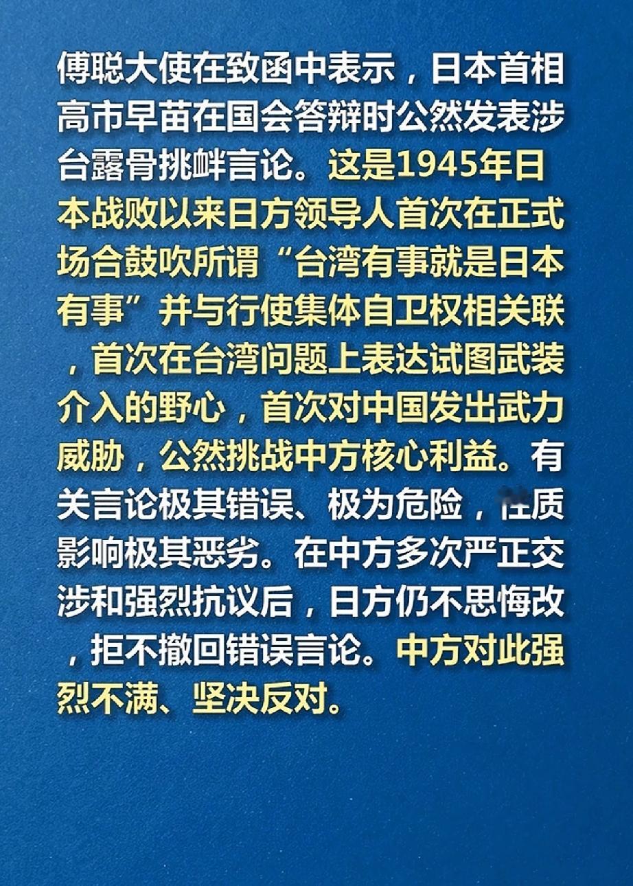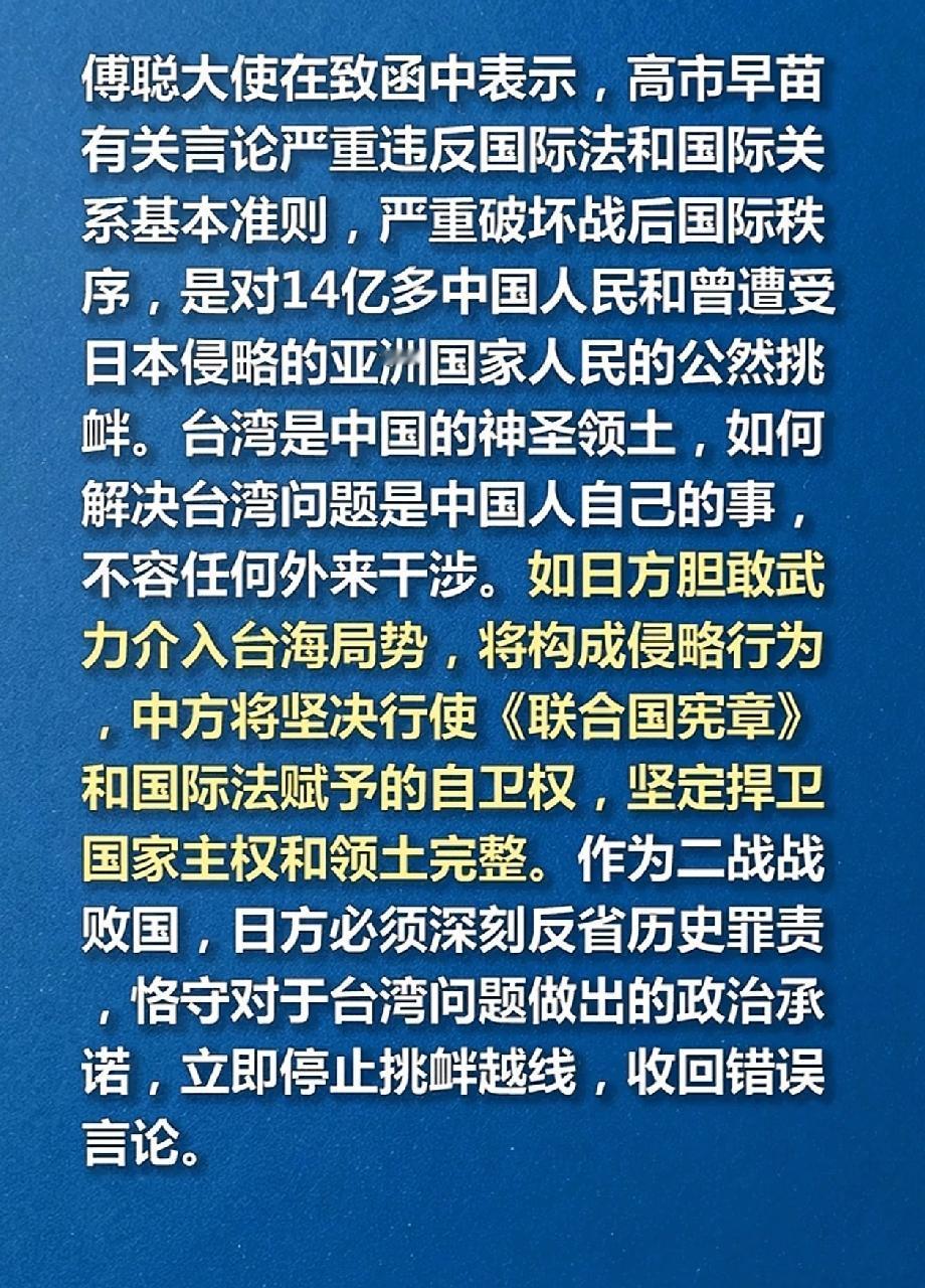 中方就高市错误言行致函古特雷斯:红线碰不得,主权不容犯! 日本首相高市早苗公然叫板“台湾有事就是日本有事”,中方直接致函联合国秘书长古特雷斯,这份文件还成了联大正式文件,让全世界都看清这场挑衅的真面目! 高市的狂妄言论绝非随口说说。在日本国会答辩时,她不仅抛出谬论,还宣称要动用“集体自卫权”,这是1945年日本战败后,首次有日方领导人在正式场合叫嚣武装介入台湾问题,更是首次对中国发出武力威胁 。台湾是中国领土的一部分,就像自家家务轮不到邻居指手画脚,日本这番操作纯属越界挑衅。 这番言论既违历史又破规矩。《开罗宣言》《波茨坦公告》早明确台湾归还中国,日本当年签字画押认了账;联合国第2758号决议也早已确认一个中国原则,台湾根本没有独立地位 。更危险的是,这会给“台独”势力壮胆,还可能搅乱东亚和平,简直是在地区安全里点火。 面对中方多次严正交涉,日方拒不撤回错误言论,中方只能亮出更硬的牌。致函联合国就是要让世界看清:日本想打破战后秩序、搞军事扩张的野心藏不住了 。中方早已划清底线:若日本敢武力介入台海,就是侵略行为,中国必依法自卫,捍卫主权绝不含糊! 值得一提的是,高市的言行连日本国内都反对,民众集会喊“辞职道歉”,前首相也痛批其“过于越界” 。国家主权从来不是谈判筹码,台湾问题是中国核心利益中的核心。中方这次致函,既是护主权,也是守公道。 如今的中国早已不是任人拿捏的模样,朋友来了有好酒,豺狼来了有猎枪!你觉得日方会收敛挑衅吗?欢迎在评论区留下观点,也别忘了转发让更多人看清真相,一起守护国家主权!