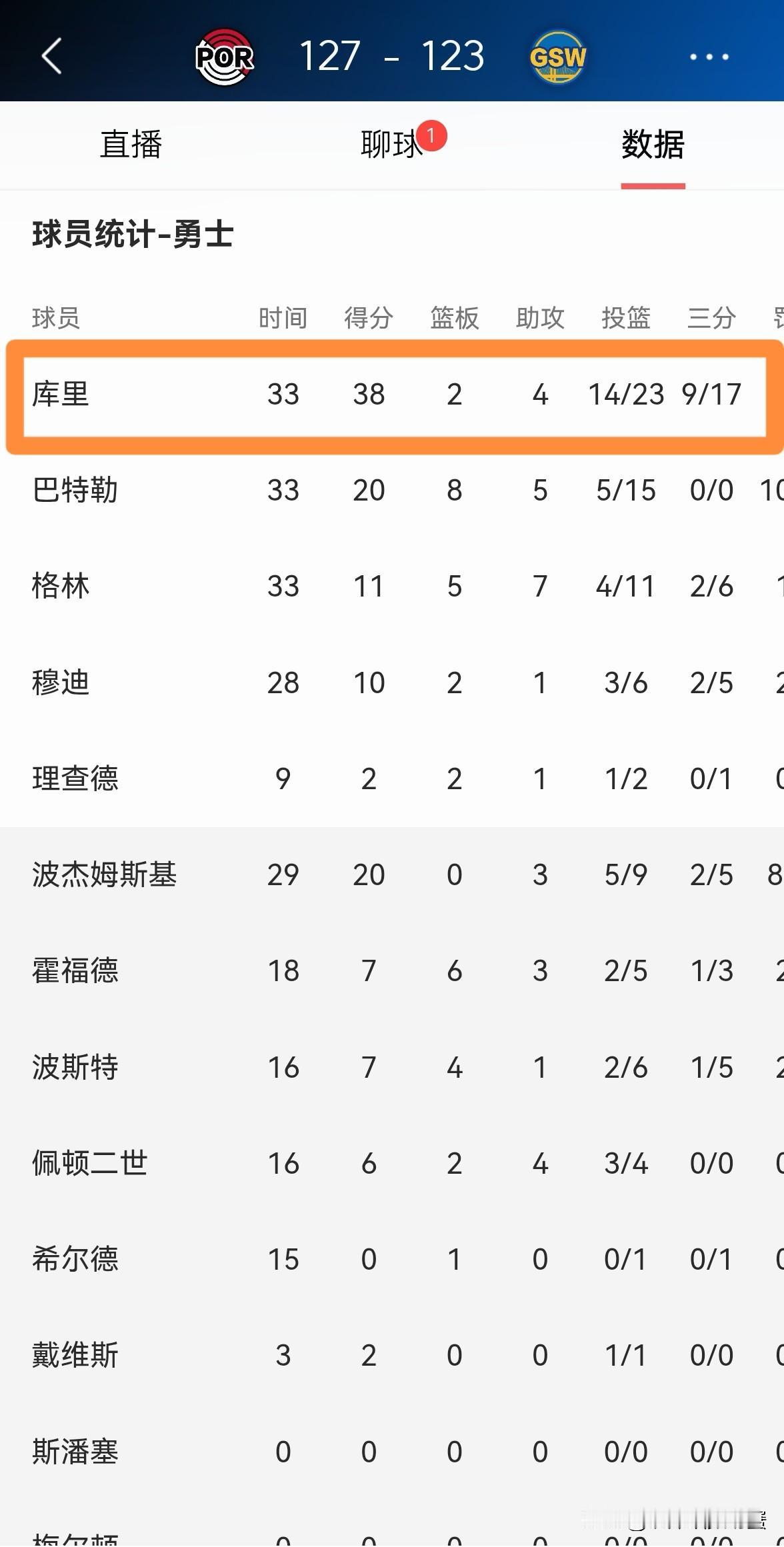 勇士超级球星库里真是太心累了!今天勇士在主场以123:127爆冷不敌开拓者,本场比赛37岁的库里打出了无可争议的表现却依然无力回天。 全场比赛下来,库里首发出战33分钟,投篮23中14,其中三分球17中9、罚球1中1爆砍38分2篮板4助攻,他的场上正负值为-3。 当库里打出如此精彩的表现时,勇士依然无法赢下比赛,由此可见勇士的其他球员打得有多差,库里能不心累吗?