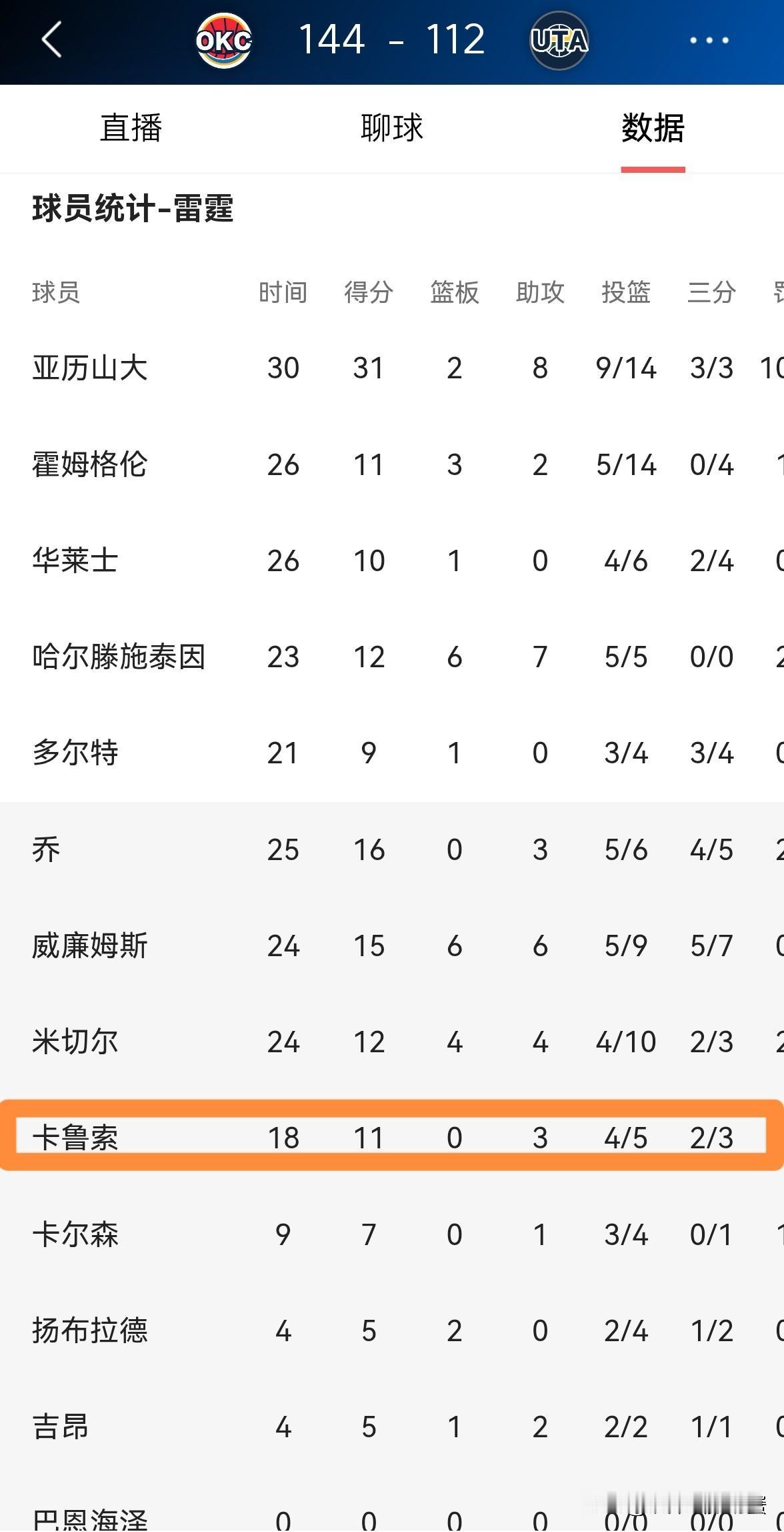 雷霆大将卡鲁索不愧是湖人出品的精品!在今天雷霆客场以144:112大胜爵士的比赛中,卡鲁索再次在攻防两端打出了极具说服力的表现。 整场比赛下来,卡鲁索替补出战18分钟,投篮5中4,其中三分球3中2极为高效的砍下11分3助攻1抢断,他的场上正负值为全队并列最高的+39。 如果卡鲁索依然效力于湖人,那该多好呀!