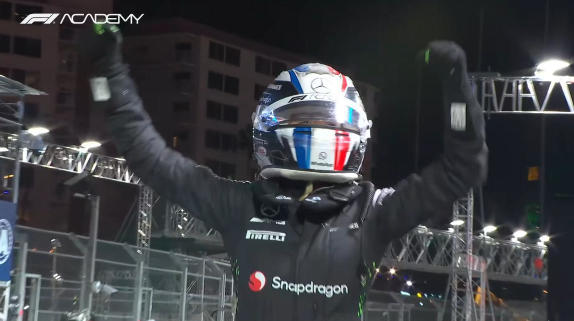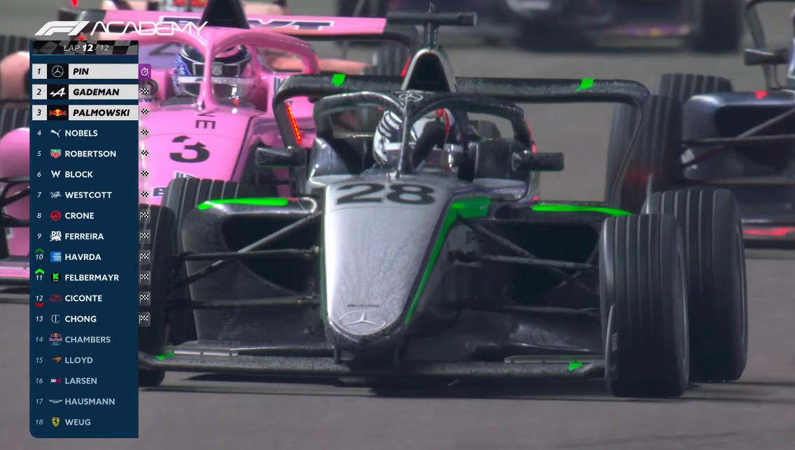 Maya Weug天崩开局啊!多里安-平直接升至第二位,两位车手这一回合之前相差9分多里安-平最终夺得了这一回合冠军,积分榜领先达到了20分。Maya Weug需要在明天最后一回合赛事夺冠才有机会翻盘。Prema提前一回合夺得了今年车队冠军。F1学院三个赛季Prema全部夺冠。