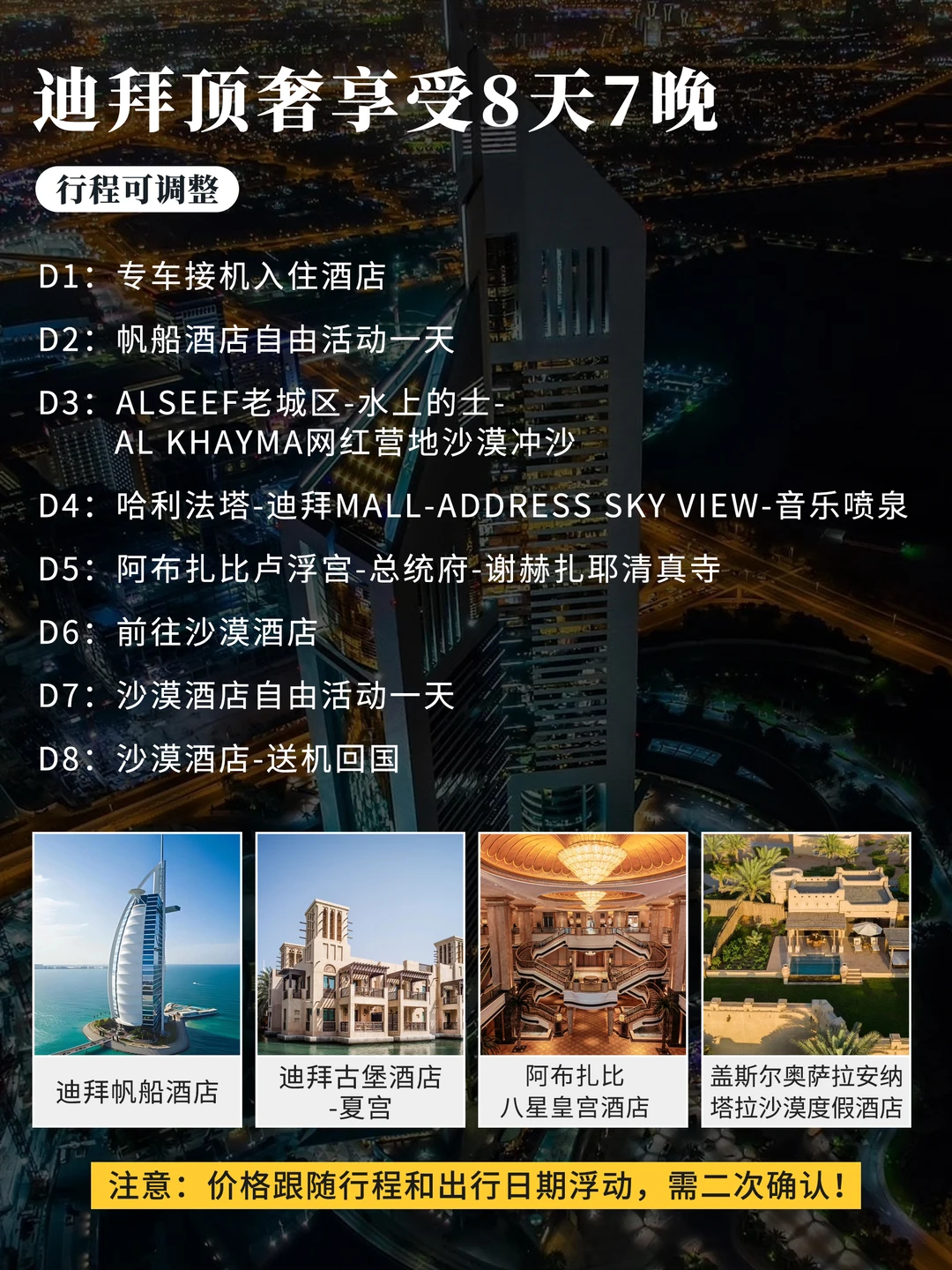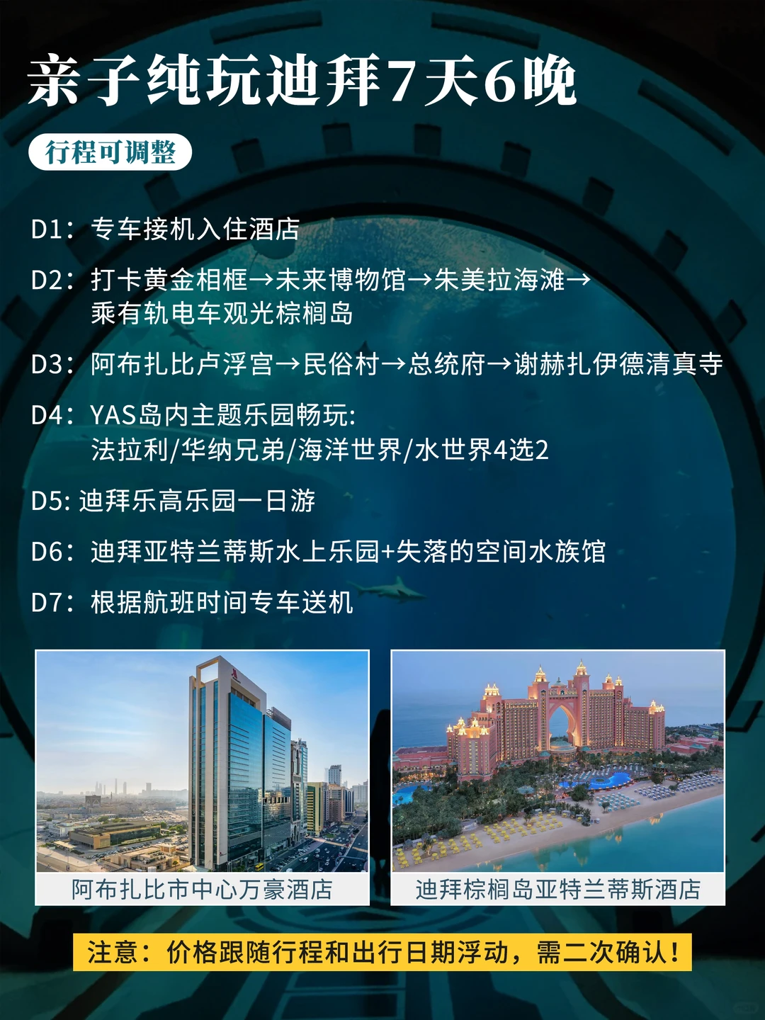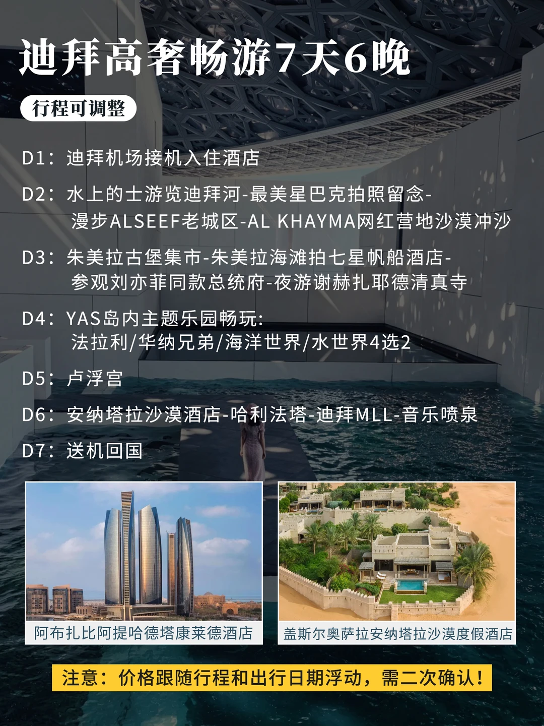 迪拜亲子游也太顶流了吧🔥 打卡黄金相框🖼️、未来博物馆拍爆亲子大片,朱美拉海滩🏖踏浪超治愈~ 坐有轨电车🚋解锁棕榈岛美景,阿布扎比卢浮宫、谢赫扎伊德清真寺🕌️边逛边涨知识! Yas岛4选2主题乐园嗨玩不停,乐高乐园、亚特兰蒂斯水世界+水族馆直接让娃玩到上头❤️‍🔥 这趟遛娃旅程幸福感拉满,妥妥的年度最佳亲子游!✅ 🔆迪拜经典景点 📍阿布扎比卢浮宫:海上“光之雨”+全球顶流藏品 📍谢赫扎伊德清真寺:施华洛世奇水晶灯+世界最大手工地毯 📍刘亦菲同款总统府:水晶灯+鎏金穹顶+镜像机位 高奢酒店🏨 🌟安纳塔拉沙漠酒店:沙丘无边泳+亲子探险+星空晚宴 🌟帆船酒店:镀金奢华+亲子友好+海景 【路线可根据需求调整】 ❤️D1:专车接机入住酒店 ❤️D2:帆船酒店自由活动 ❤️D3:AlSeef老城区-水上的士-Al khayma网红营地沙漠冲沙 ❤️D4:哈利法塔-迪拜mall-address sky view-音乐喷泉 ❤️D5:阿布扎比卢浮宫-总统府-谢赫扎耶清真寺 ❤️D6:前往沙漠酒店 ❤️D7:沙漠酒店自由活动一天 ❤️D8:沙漠酒店-送机回国 如何定制❓ 在评论区留言,或后台发送【人数+出发日期】🆕小编...会在D一时间回复
